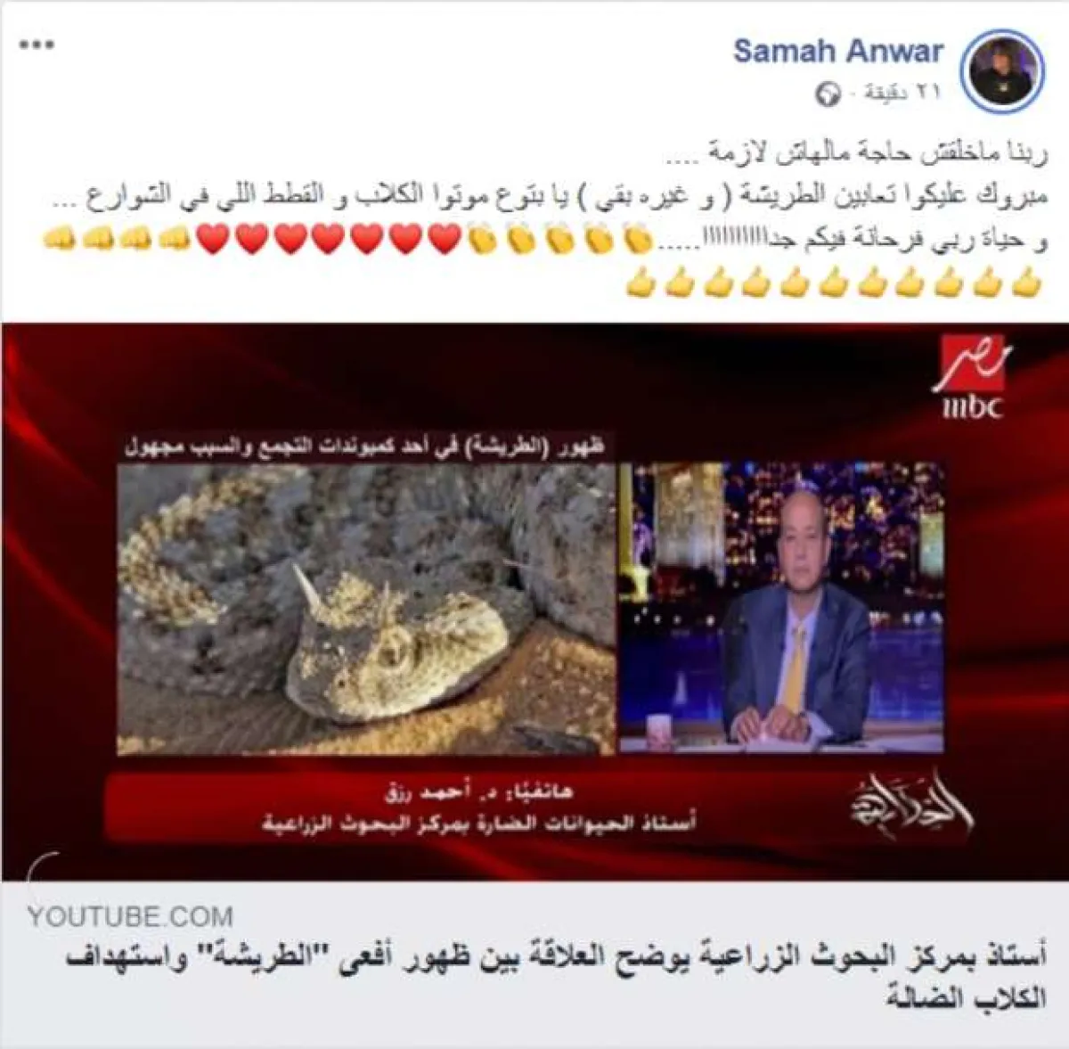 لم تخفي الفنانة المصرية سماح أنور شماتتها في بعض سكان مدينة القاهرة الجديدة، بعدما تعرضوا لهجوم مباغت من الأفاعي القاتلة، بعد أيام قليلة من تنفيذ حملة لقتل الكلاب والقطط الضالة، مؤكدة أنها سعيدة لأن هؤلاء السكان تعمدوا الإخلال بالتوازن البيئي وتحملوا وزر قتل حيوانات بريئة بطرق وحشية منها وضع السم بدون أسباب مقنعة.