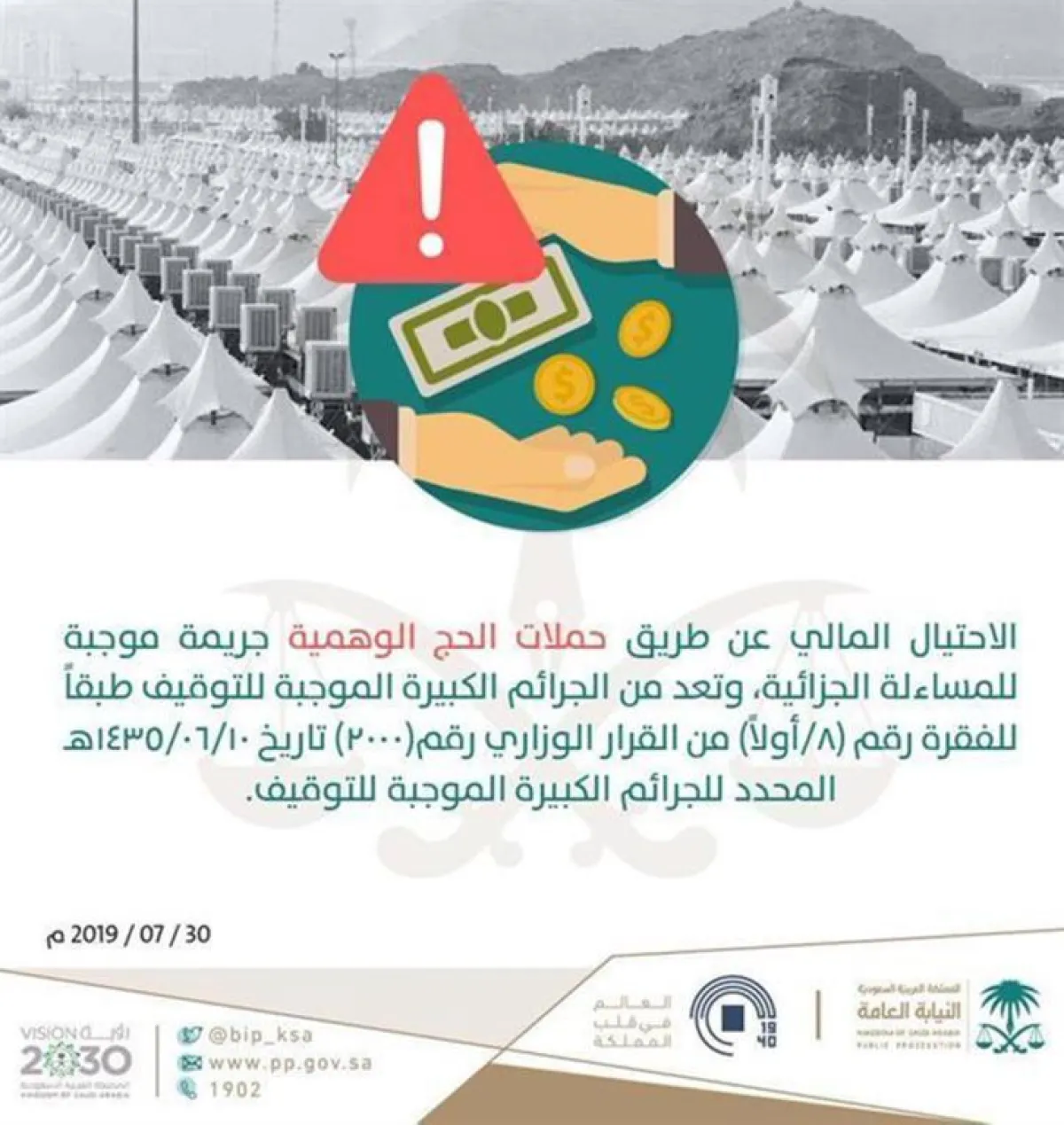 وكانت النيابة العامة قد حذرت في وقت سابق من انتشار بعض حملات الحج الوهمية بالتزامن مع بدء موسم الحج في المملكة العربية السعودية، واتخاذ البعض من الأشخاص منها تجارة للاحتيال على المواطنين والمقيمين، وفي هذا الأمر أكدت النيابة العامة أنه يندرج تحت قضايا المال الكبرى التي تستوجب الإيقاف والمساءلة الجزائية.