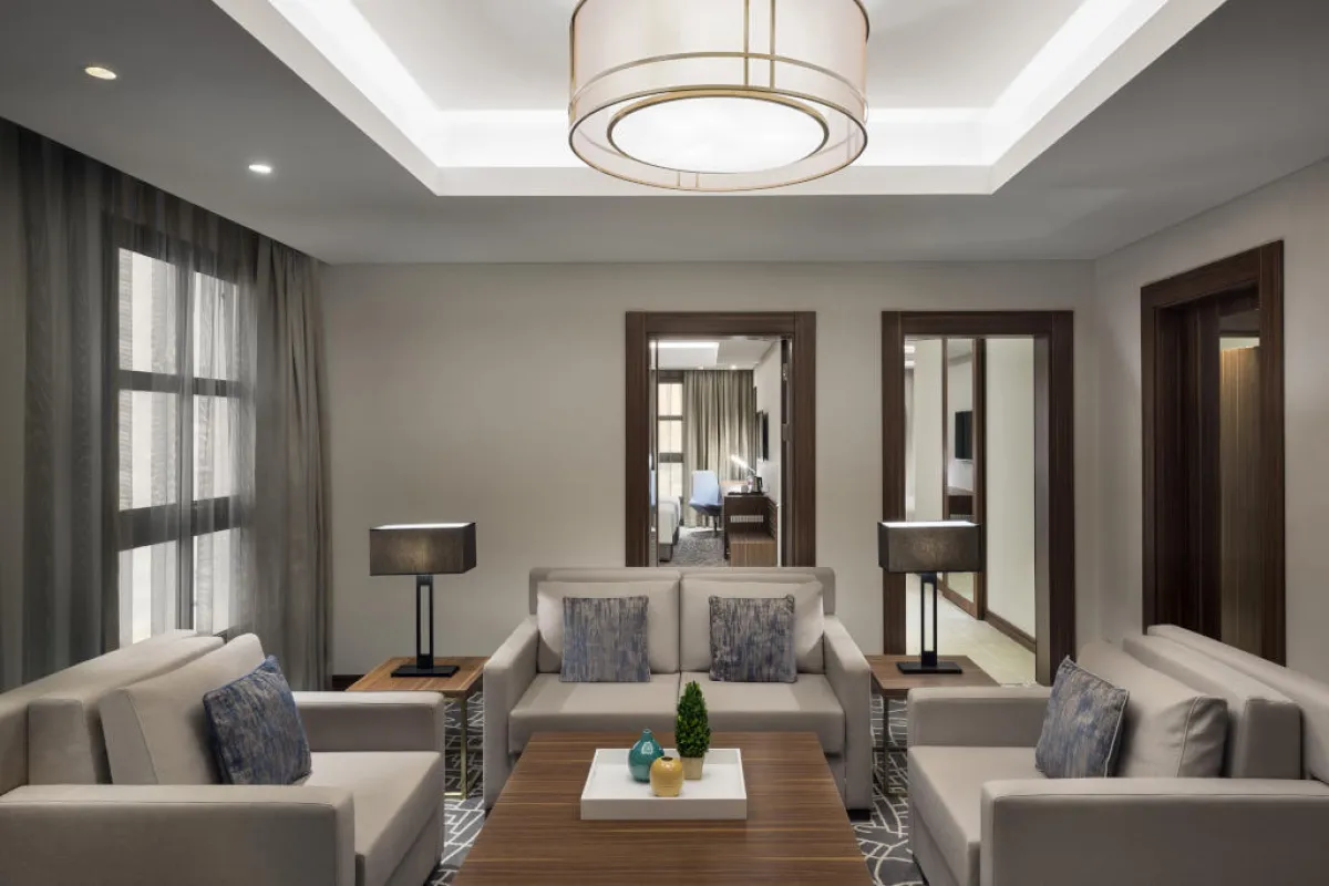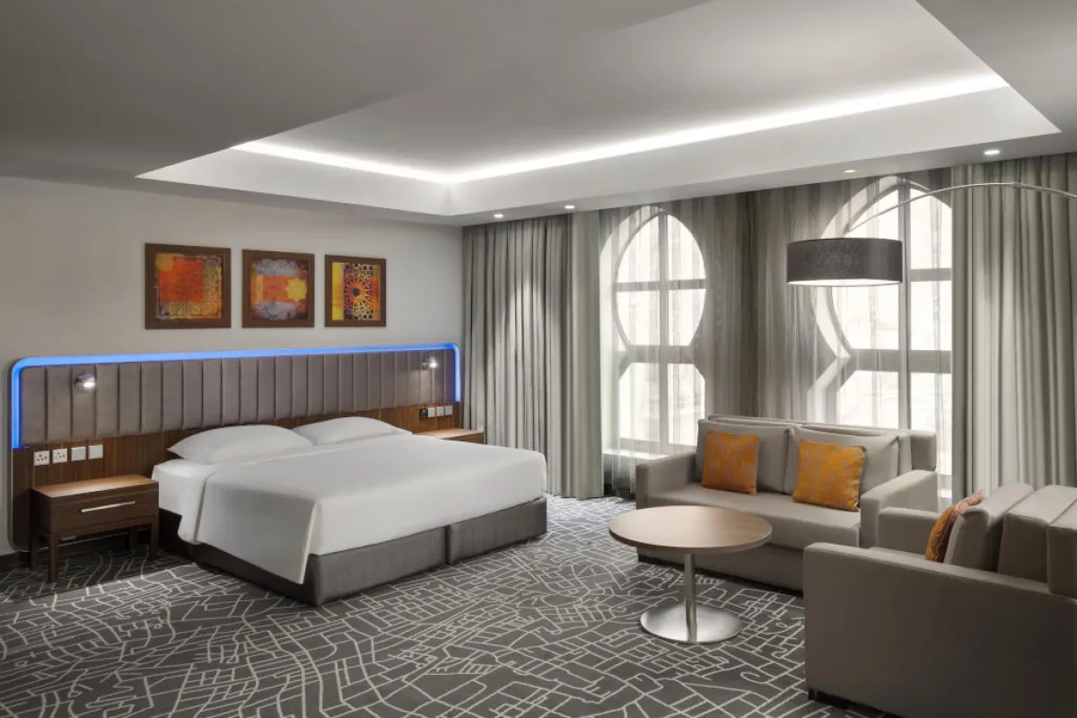 يتألف الفندق من 355 غرفة وجناحًا بتصميم عصري، يطلّ معظمها على المدينة المقدسة. يمكن للضيوف الاختيار بين سريرين منفردين أو سرير مزدوج، وتحتوي كل غرفة على نظام تحكم فردي في درجة الحرارة، وأريكة وصندوق أمانات، وخدمة الاتصال بشبكة الإنترنت اللاسلكي فائقة السرعة، مجانًا.