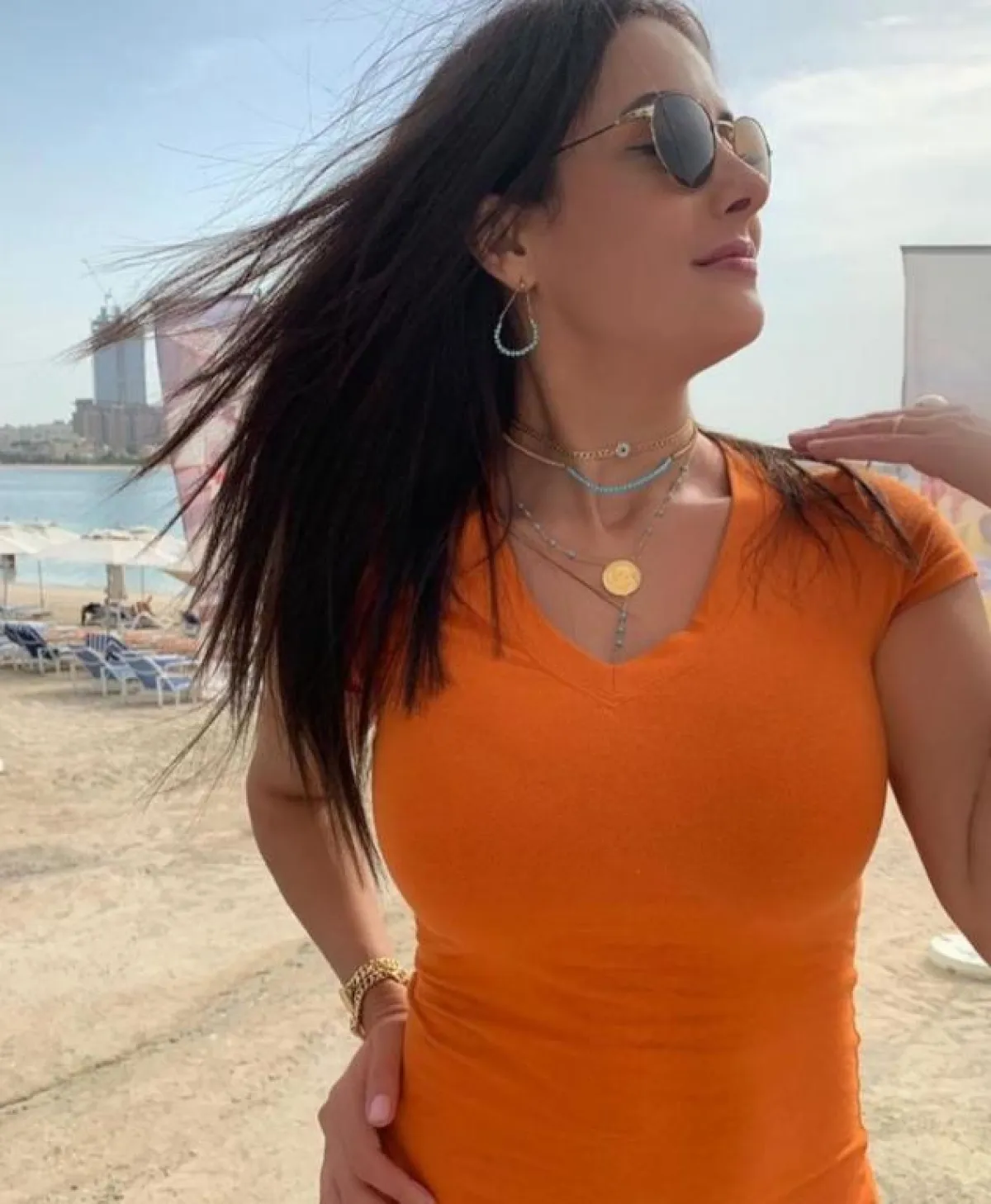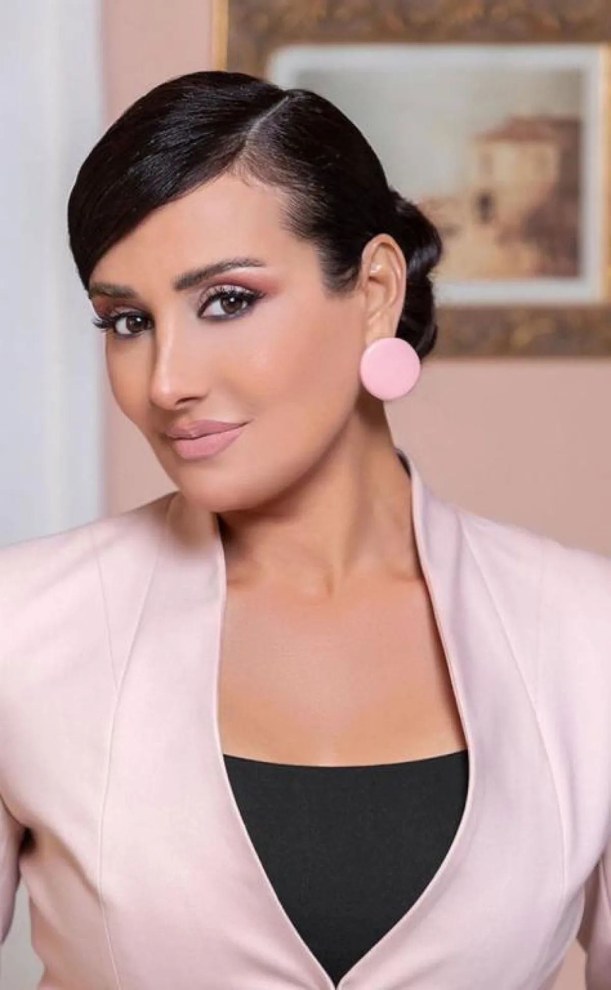 كذلك، اختارت أقراطًا دائرية، تميل إلى الضخامة، باللون الوردي، وأخرى صغيرة على شكل اللؤلؤ، وتألقت بأقراط فضية طويلة، بشكل سداسي، وظهرت بأقراط دائرية حمراء، تزيِّن حوافها اللون الذهبي، وأقراط ذهبية أكثر نعومة، بشكل دمعة، وتزيَّنت بأقراط ذات زينة ذهبية، بشكل زهري بيضوي، وأقراط ذهبية مزيَّنة باللؤلؤ، إضافة إلى أقراط ملونة، منها أقراط طويلة زهرية بخيوط، نسَّقتها مع ساعه ذهبية، وأقراط بيضاء بخيوط طويلة.