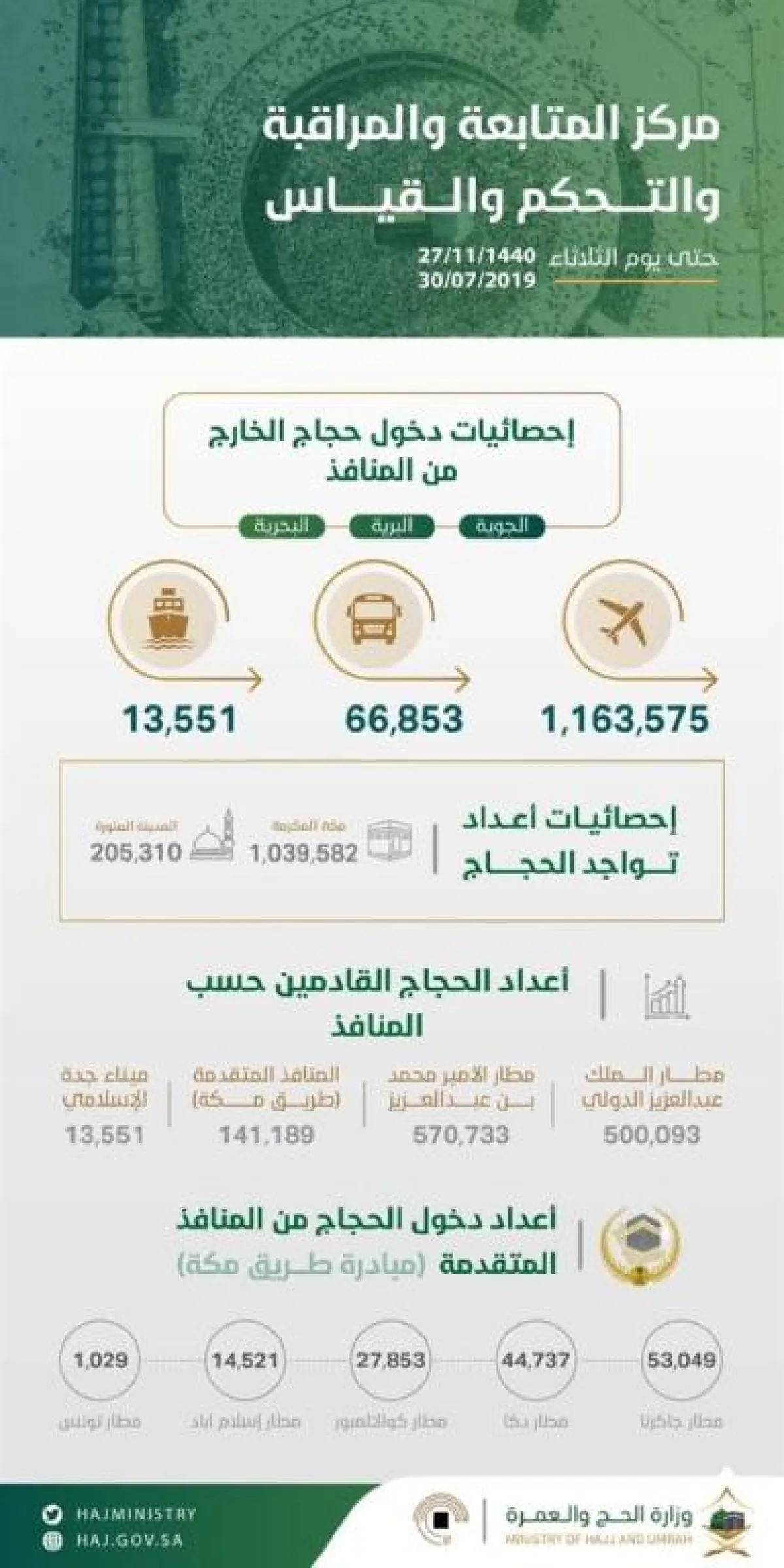 كشفت إحصائيات المديرية العامة للجوازات أن عدد الحجاج الذين وصلوا المملكة حتى نهاية يوم أمس الأول بلغ مليونا و250 ألف حاج وحاجة، عبر جميع المنافذ الجوية والبرية والبحرية.
