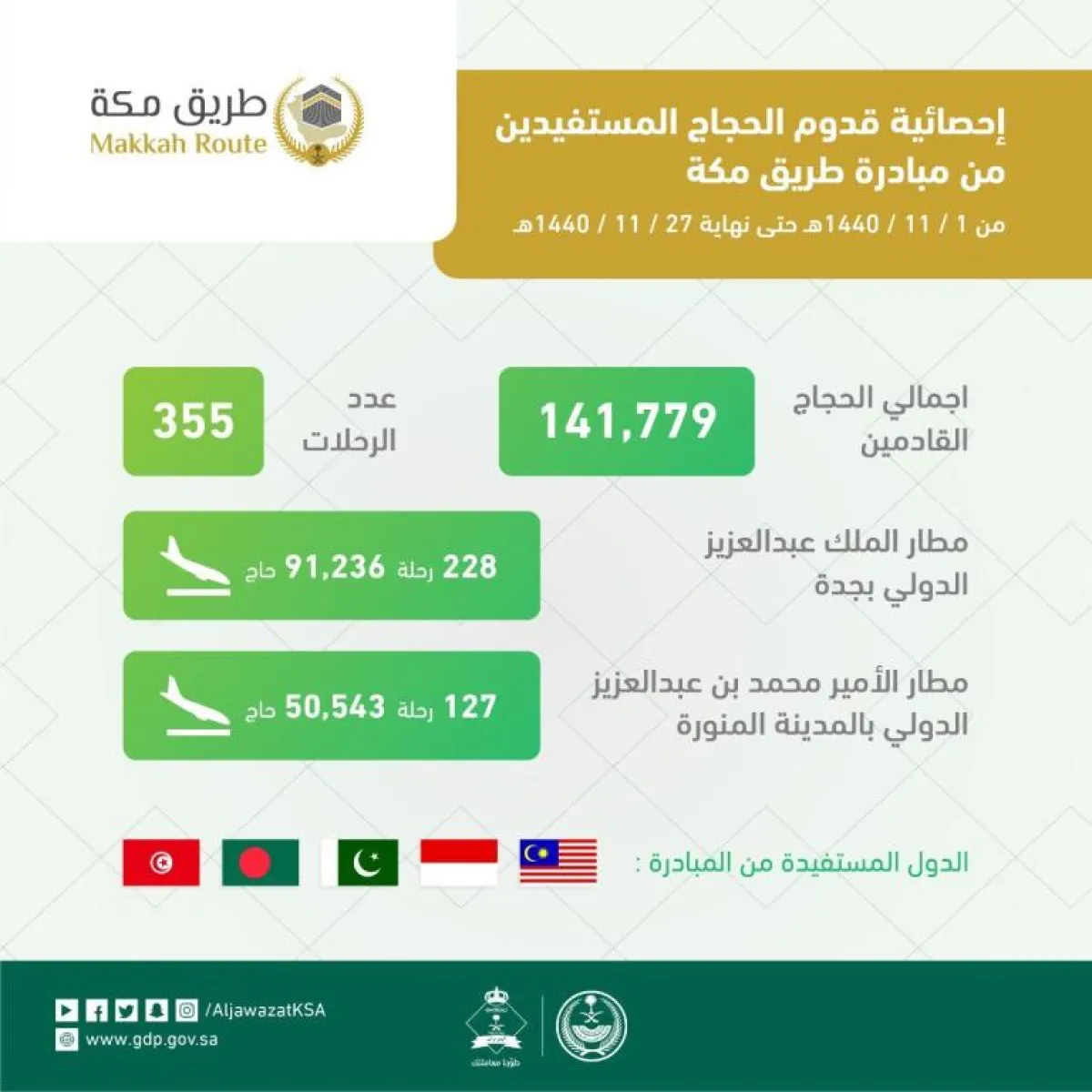 ومن جهة أخرى ارتفع عدد الدول التي يتم تطبيق إجراءات مبادرةطريق مكة في مطاراتها من دولتين «ماليزيا وإندونيسيا» في موسم حج 1439هـ إلى خمس دول بموسم حج 1440هـ بإنضمام تونس وباكستان وبنجلاديش للمبادرة، حيث بلغ 141.779 اجمالي عدد الحجاج المستفيدين من مبادرة طريق مكة.