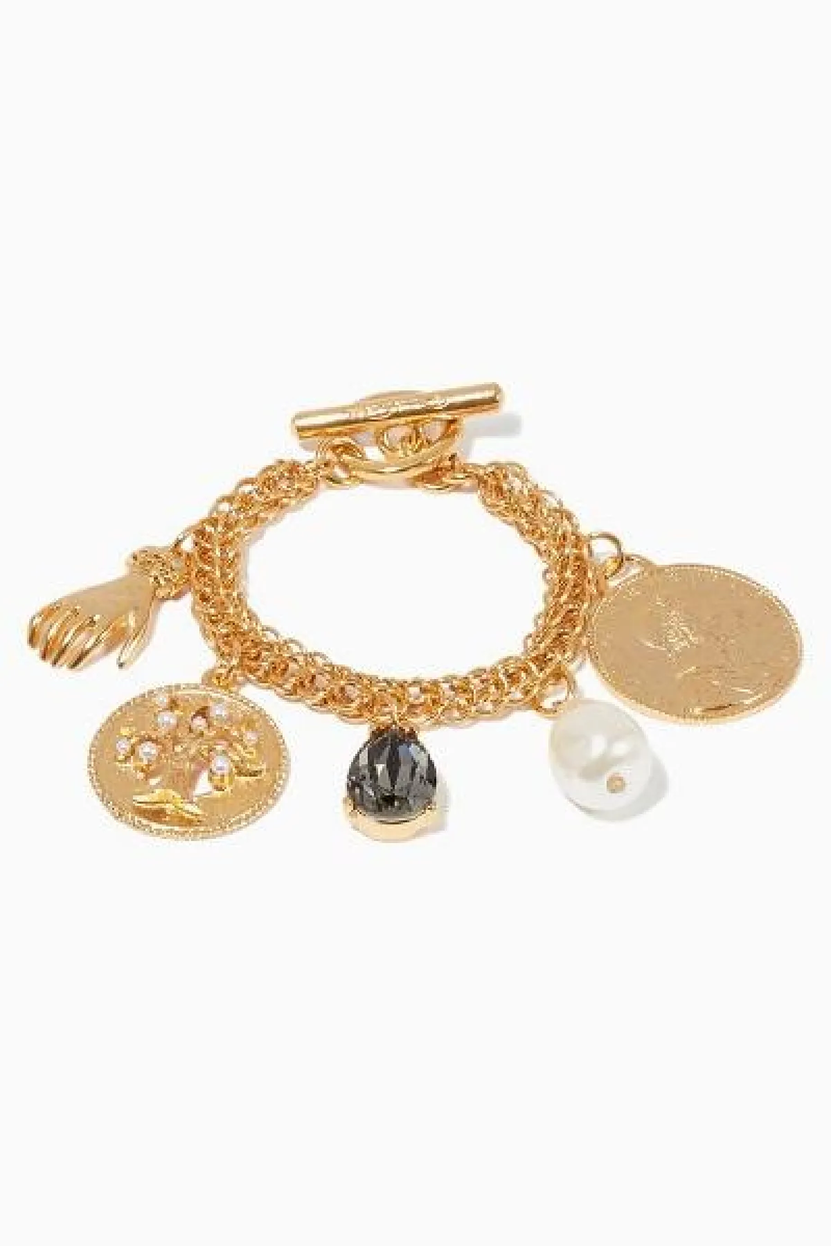 سيمثل هذا السوار المصمم من سلسلة ذهبية ضخمة من أوسكار دي لارينتا Oscar de la Renta إضافة مميزة إلى مجموعة مجوهراتك؛ فهو مصمم بسلسلة عصرية تتدلى منه حلي مرصعة بالكريستال واللؤلؤ الكبير الصناعي.