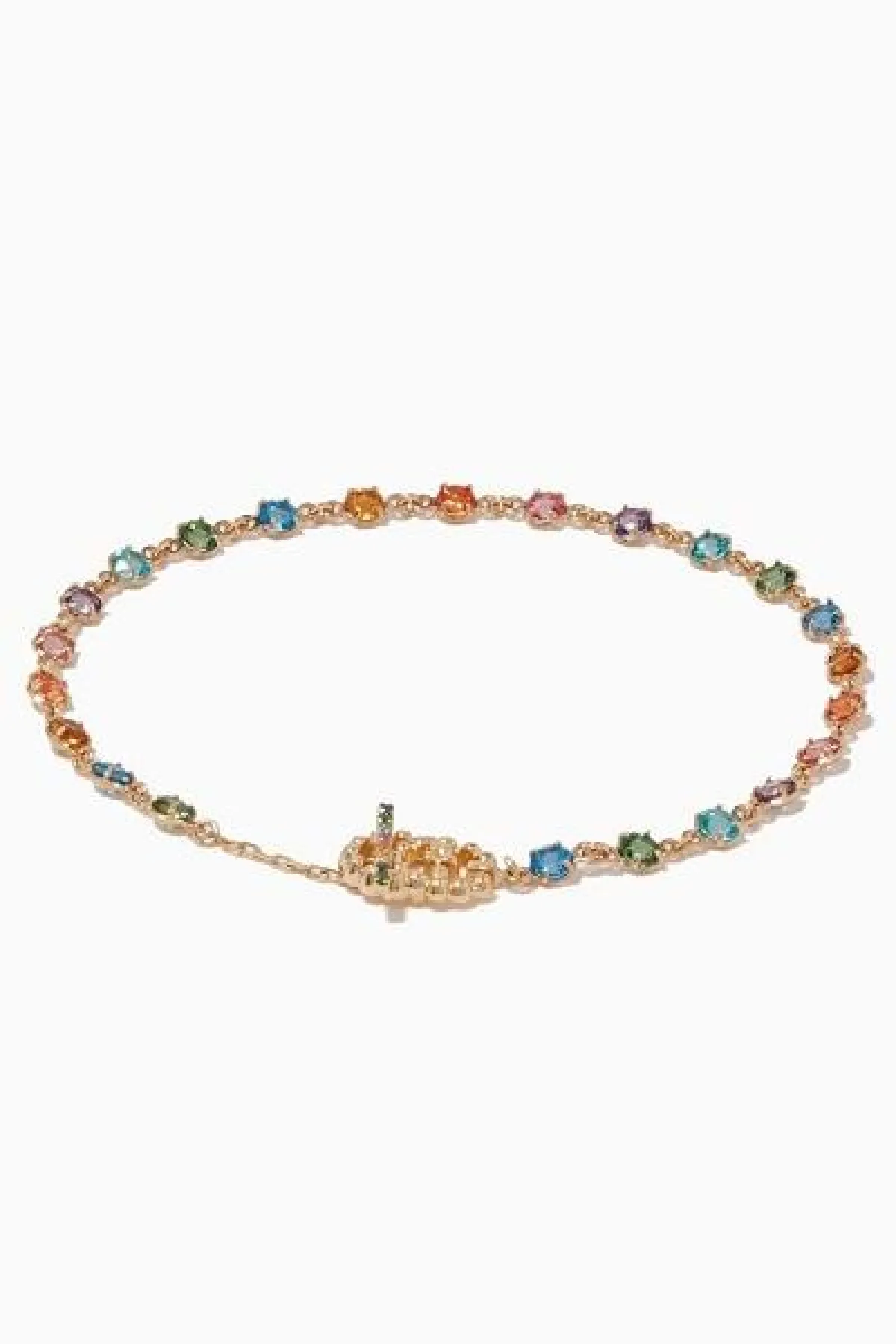 من دار غوتشي Gucci اخترنا لك سواراً من الذهب الأصفر المرصع بالأحجار الملونة، وكأنه قوس قزح. يتميز هذا السوار بتصميم حرفي G المتداخلين بوصلة مفصلية أنيقة.