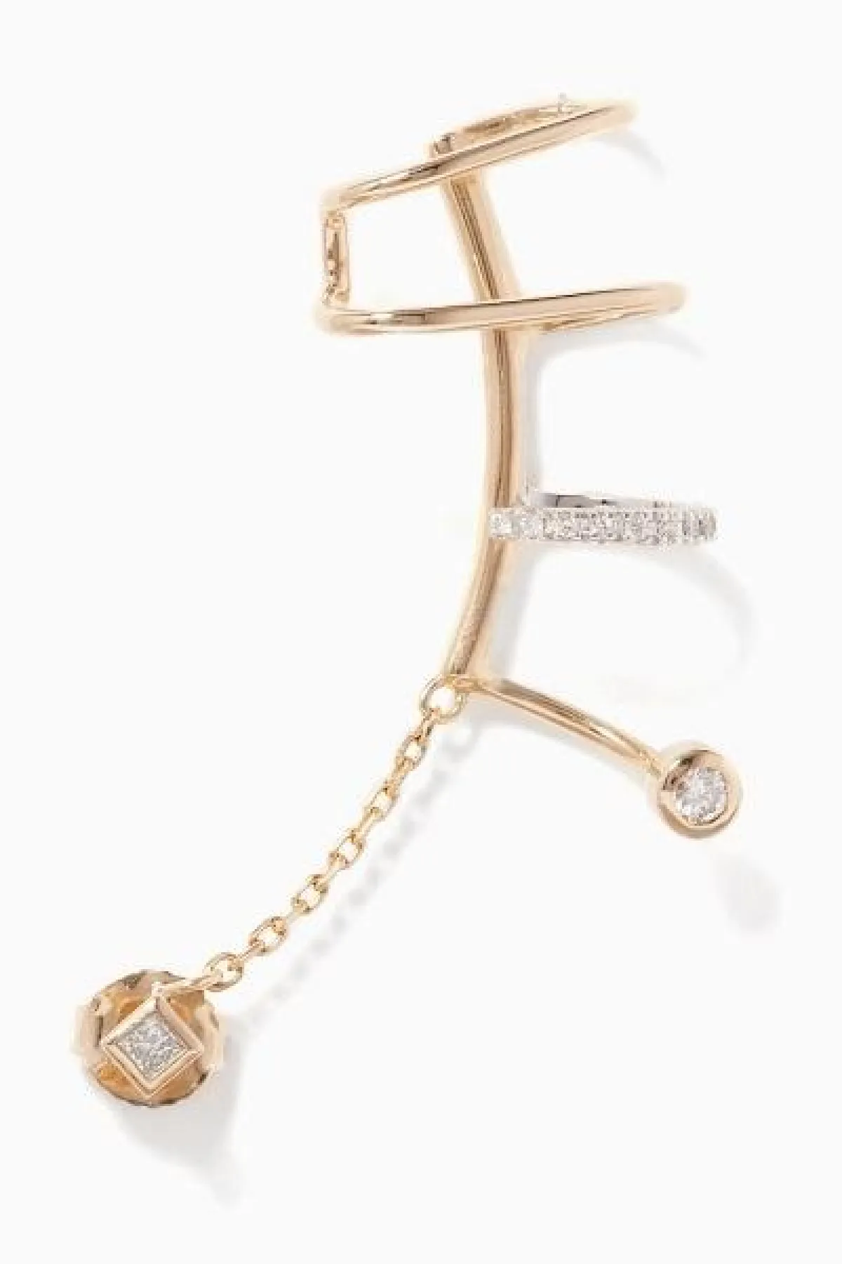 من علامة ماريا بلاك Maria Black اخترنا أقراط أصفاد الأذن المصممة من الذهب الأصفر عيار 14 قيراطاً والمرصعة بالألماس الفاخر.