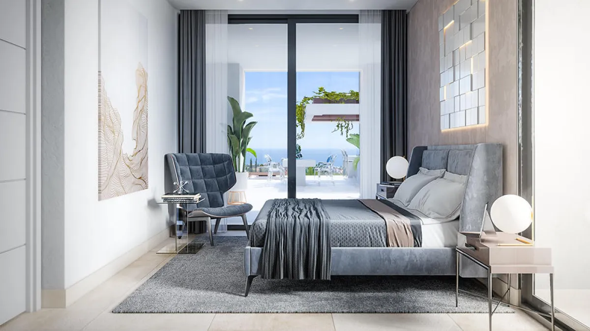 يلعب الرمادي دور البطولة في غرفة النوم الرئيسة، إذ يحلُّ على معظم مُكوِّناتها، فيما يتسلَّل البيج الفاتح المائل إلى الزهري العسلي إلى المكان، ليتشارك في إعداد ديكور الجدار خلف السرير الذي تتوسَّطه لوحة خالية، عبارة عن مربعات بيضاء شبه متلاصقة من الرسومات، وتتخلَّلها الإنارة لتضفي جاذبية على المساحة.