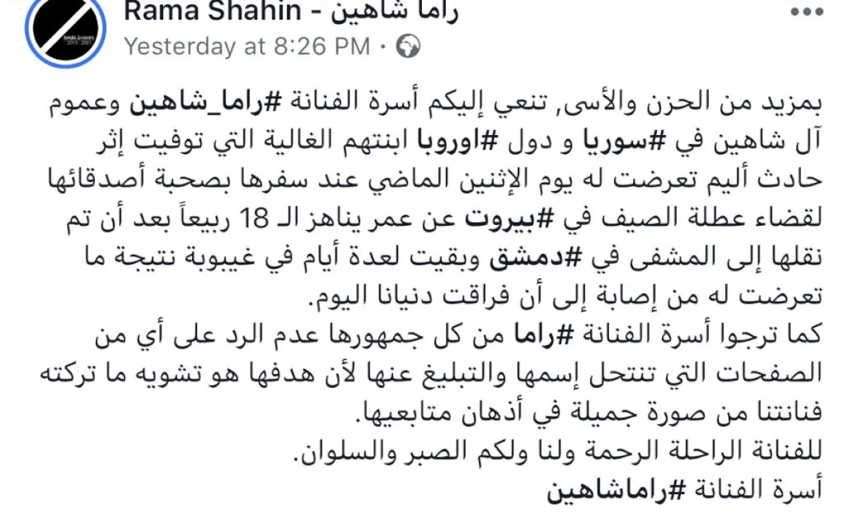 فيما قامت عائلة راما شاهين بإغلاق كل صفحاتها على مواقع التواصل الاجتماعي؛ منعاً لأي تشويه قد يحصل بحسب ما تم تناقله عبر وسائل الإعلام.