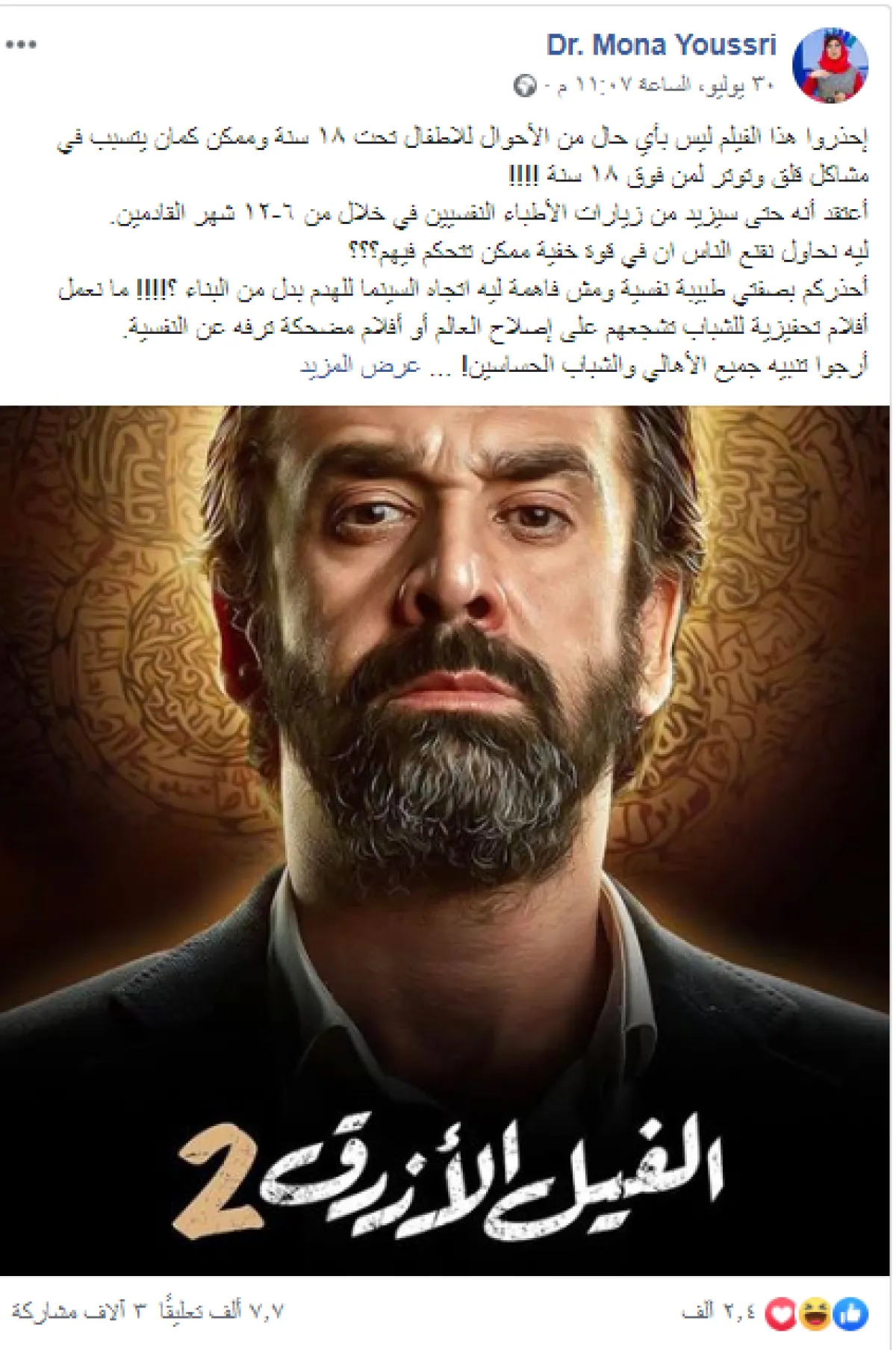 أطلقت الطبيبة النفسية منى يسري تحذيرا عاجلا للأسر المصرية والعربية من خطورة مشاهدة الجزء الثاني لفيلم "الفيل الأزرق2" للنجوم كريم عبد العزيز ونيللي كريم وهند صبري وإياد نصار، مؤكدة أن أحداث الفيلم قد تصيب المشاهد تحت عمر 18 سنة بأمراض القلق والتوتر، وتوقعت أن تزيد أعداد زيارات الأطفال إلى مراكز الطب النفسي خلال الشهور القادمة بسبب هذا الفيلم.