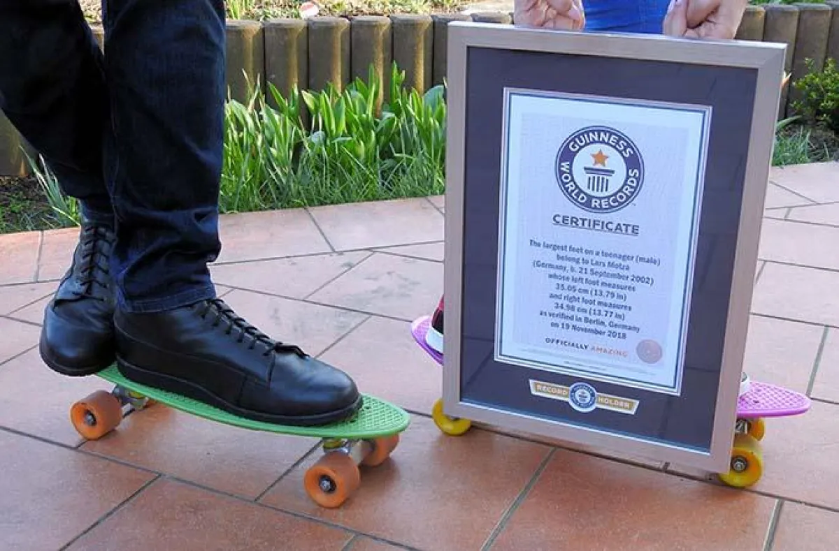 وبحسب موقع «جينيس وورلد ريكوردز» تم كسر الرقم القياسي لأكبر قدم لمراهق (ذكر) من قبل المراهق الألماني «لارس موتزا»، الذي يبلغ عمره 16 عاماً و59 يوماً، حيث يبلغ طول قدمه اليسرى 35.05 سم (13.79 بوصة)، واليمنى 34.98 سم (13.77 بوصة). مما يجعل قدميه ذات حجم ضخم.