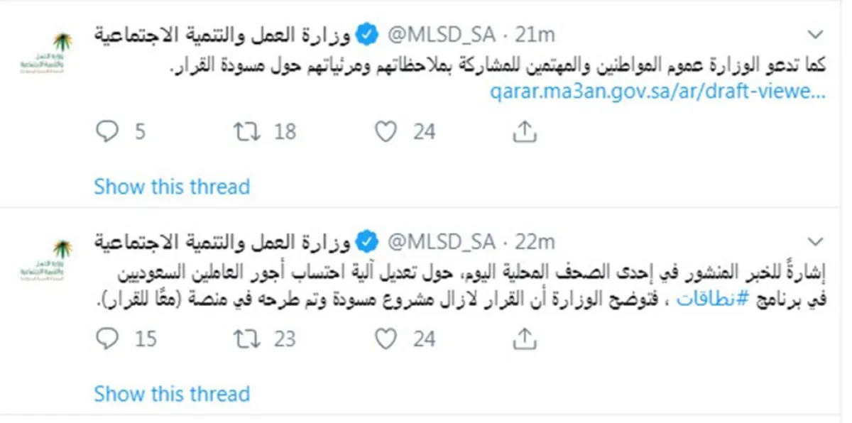 وأوضحت وزارة العمل والتنمية الاجتماعية، عبر حسابها الرسمي على موقع التواصل الاجتماعي "تويتر"، أن تعديل آلية احتساب أجور العاملين من المواطنين في برنامج "نطاقات"، لا زال مشروع مسودة، ولم يصدر بشأنه قرار نهائي.