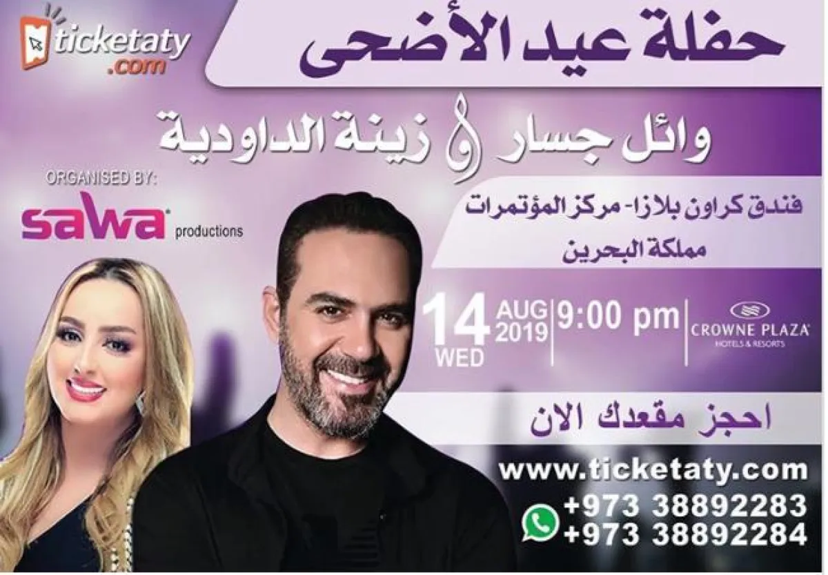وائل جسار، يحيي حفله الأول في البحرين بمناسبة عيد الأضحى مع زينة الداودية في 14 آب\أغسطس في الكروان بلازا.