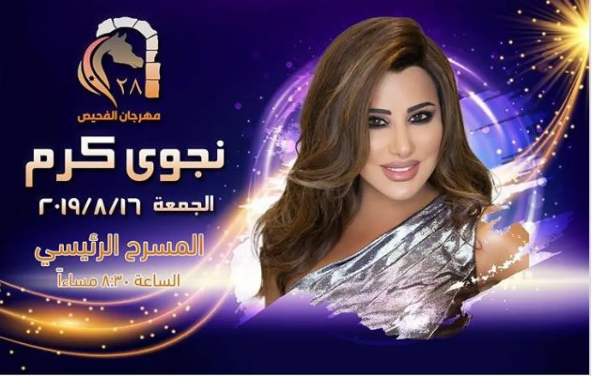 نجوى كرم تشارك في مهرجان الفحيص في دورته الـ 28 وتحيي حفلاً على المسرح الرئيسي في 16 آب\أغسطس.