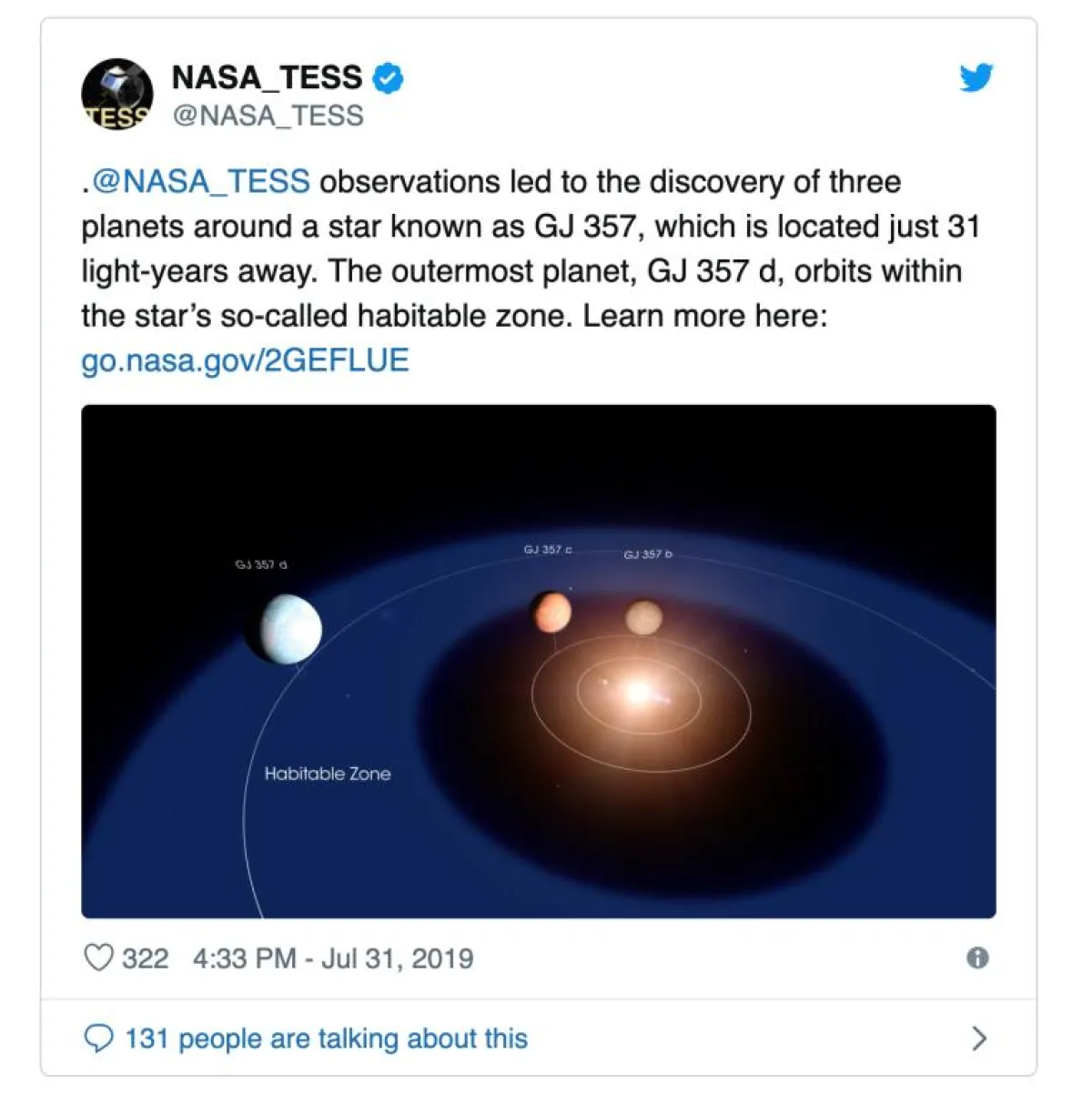 ويدور الكوكب المسمى GJ 357 d، حول نجم على بعد نحو 31 سنة ضوئية، فيما يعرف باسم المنطقة الصالحة للسكن، وهي منطقة بعيدة عن نجمها، حتى لا تكون شديدة الحرارة، ولكنها قريبة بدرجة كافية كي لا تكون باردة جداً.