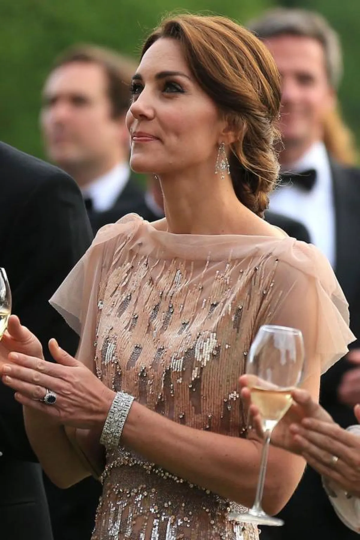 - وخلال حفل غالا، أخذ من إيست آنغليا East Anglia مقراً له، ظهرت كيت ميدلتون بإطلالة لافتة، منسّقةً فستاناً ناعماً من تصميم جيني باخام Jenny Packham مع زوج من الأقراط الناعمة المتدلية بشكل ثريا مرصّعة بالألماس.