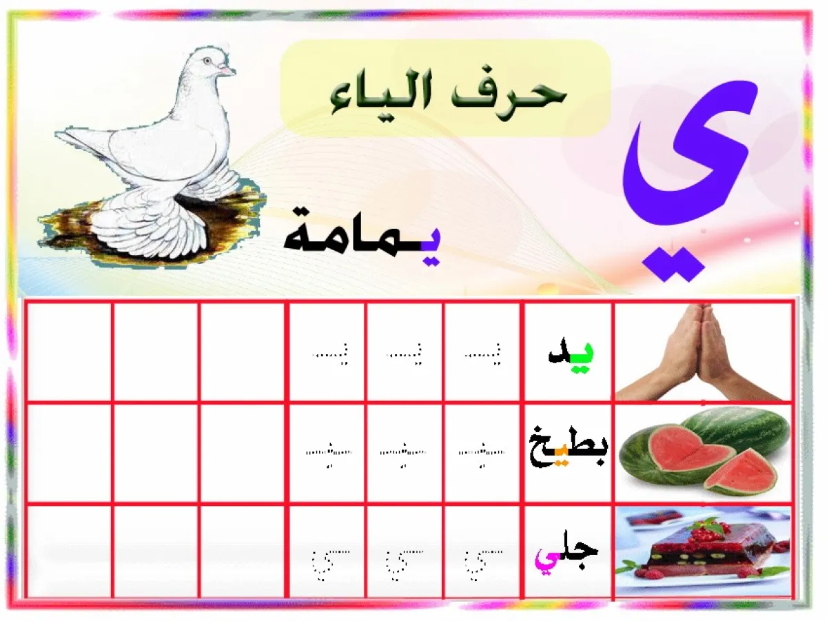 - أكتبي كلمات تحتوي على حرف الياء ثم أطلبي من الطفل أن يلون حرف الياء منفرداً.