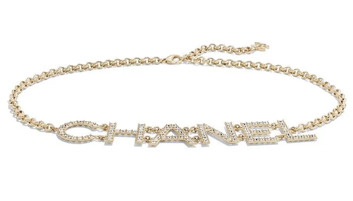 هذا النمط من الأحزمة مصنوع من سلسلة ذهبية اللون، مع تصميم نحيف للغاية، أضافت دار شانيل chanel حروفًا بشعار الدار بالكريستال. يثبّت الحزام من الخلف بطريقة تشبه القلادة ، بحيث يكون لديكِ الكثير من التحكم في طوله.