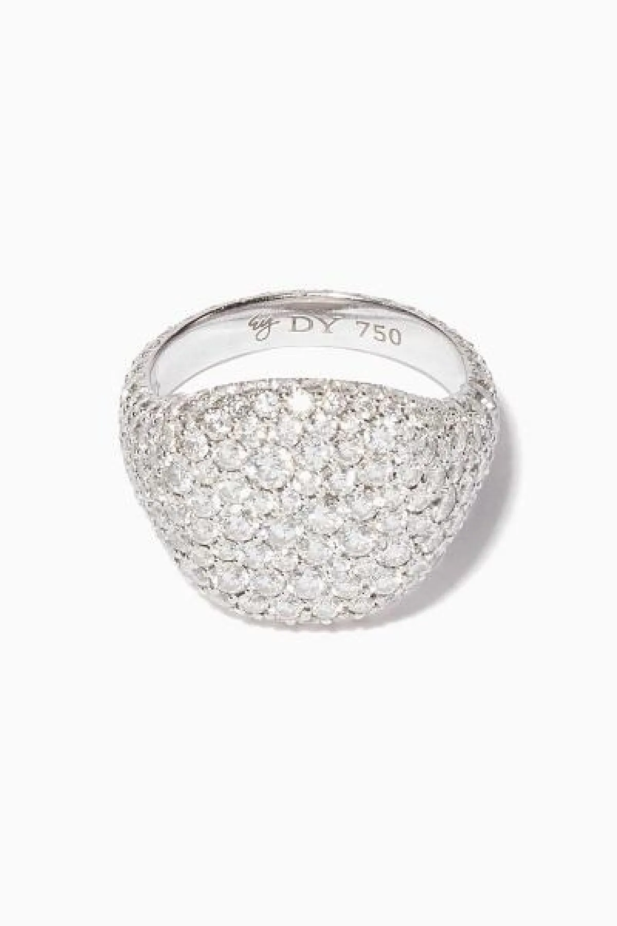 من علامة ديفيد يورمان David Yurman اخترنا خاتم الألماس للخنصر Pinky، والذي يعدّ تعبيراً عن تفرد وتميز الدار ورمزاً للدقة والإتقان وتجسيداً عصرياً للكلاسيكية. تم تصميم هذا الخاتم ببراعة من الذهب الأبيض وترصيعه بالألماس البراق وهو ذو تصميم سهل الارتداء في أصبع الخنصر.