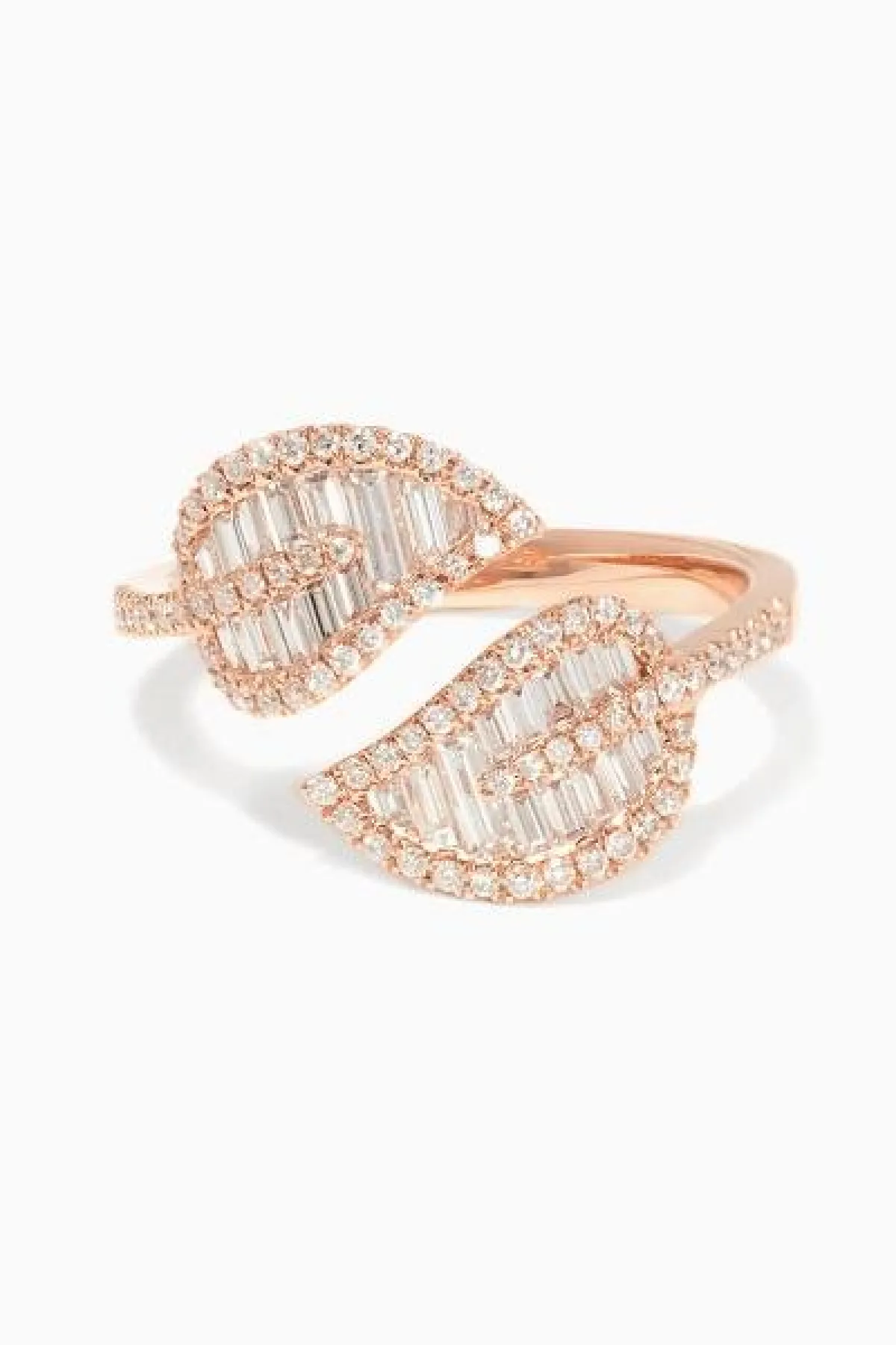 أضيفي لمسة مفعمة بالرقة إلى إطلالتك بارتداء هذا الخاتم الألماس Leaf من أنيتا كو Anita Ko المصنوع من الذهب الوردي عيار 18 قيراطاً. يأتي الخاتم بتصميم ملفوف حول الأصبع على شكل أوراق شجر متداخلة مرصعة بحبات الألماس الدائرية والمستطيلة البراقة.
