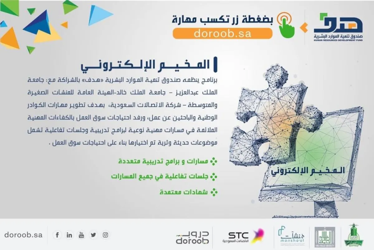 ويُقدم المخيم برامج تدريبية إلكترونية وجلسات تفاعلية، في تسعة مسارات، بالشراكة مع جامعة الملك عبدالعزيز وجامعة الملك خالد والهيئة العامة للمنشآت الصغيرة والمتوسطة (منشآت) وشركة الاتصالات السعودية (STC)، لتزويد كافة شرائح المجتمع من الطلبة والباحثين عن عمل ومن هم على رأس العمل وأصحاب المنشآت الصغيرة والمتوسطة ورواد الأعمال، بالمعارف والمهارات اللازمة لاحتياجات سوق العمل، تحقيقاً لمستهدفات رؤية المملكة 2030 .