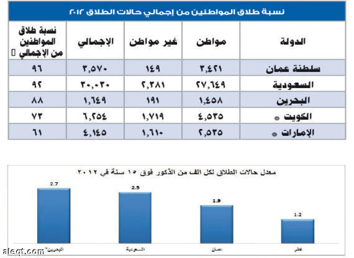 وبحسب الدراسة بلغ معدل حالات الطلاق في السعودية في 2012، نحو 2.5 حالة لكل ألف نسمة فوق سن 15 سنة من الذكور في العام نفسه، لتحتل الترتيب الثاني بين دول مجلس التعاون الخليجي بعد "البحرين" التي بلغ المعدل فيها نحو 2.7 حالة طلاق لكل ألف من الذكور فوق 15 سنة، أما ثالث القائمة فكان لسلطنة عمان والمركز الرابع لقطر.