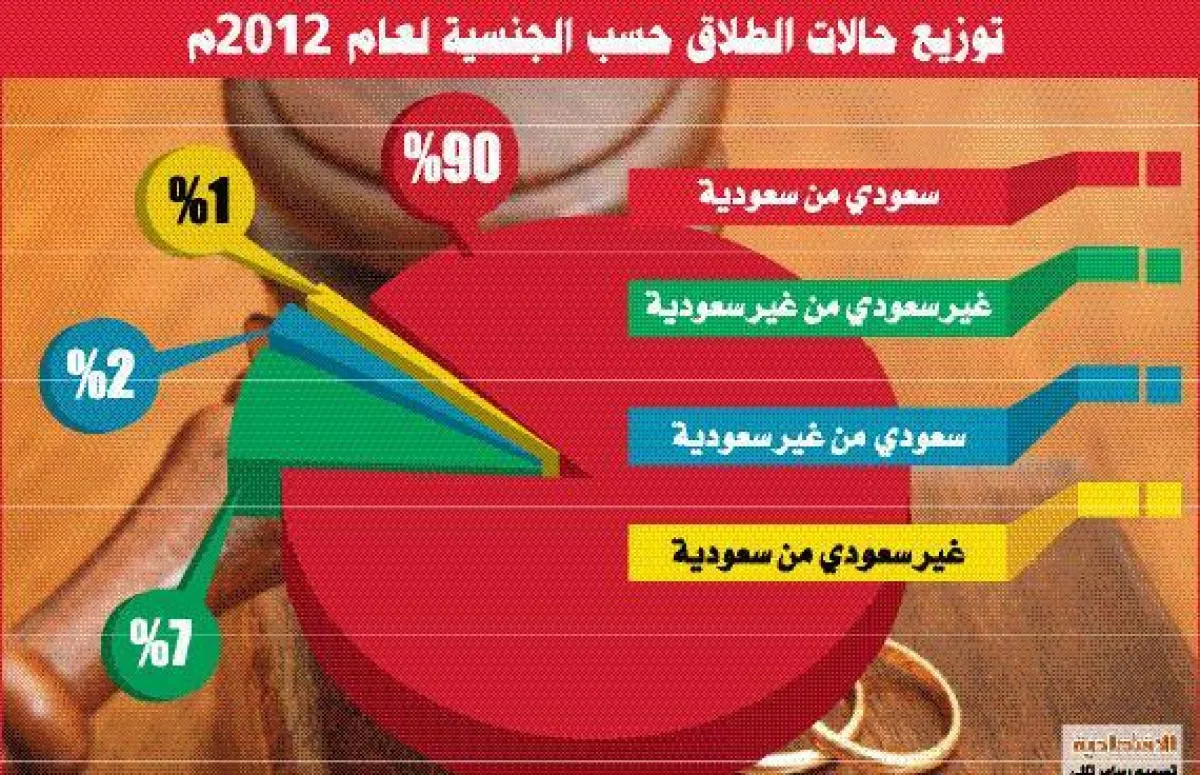 تلتها "فئة غير السعودي المتزوج من غير سعودية" من حيث أعلى حالات الطلاق، بنسبة 7 في المئة من إجمالي حالات الطلاق خلال 2012، حيث بلغت حالات الطلاق في هذه الفئة نحو 2174 حالة.