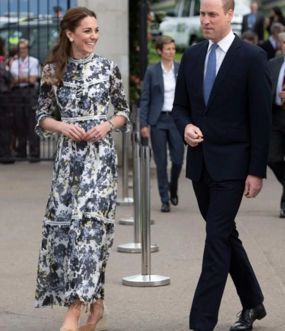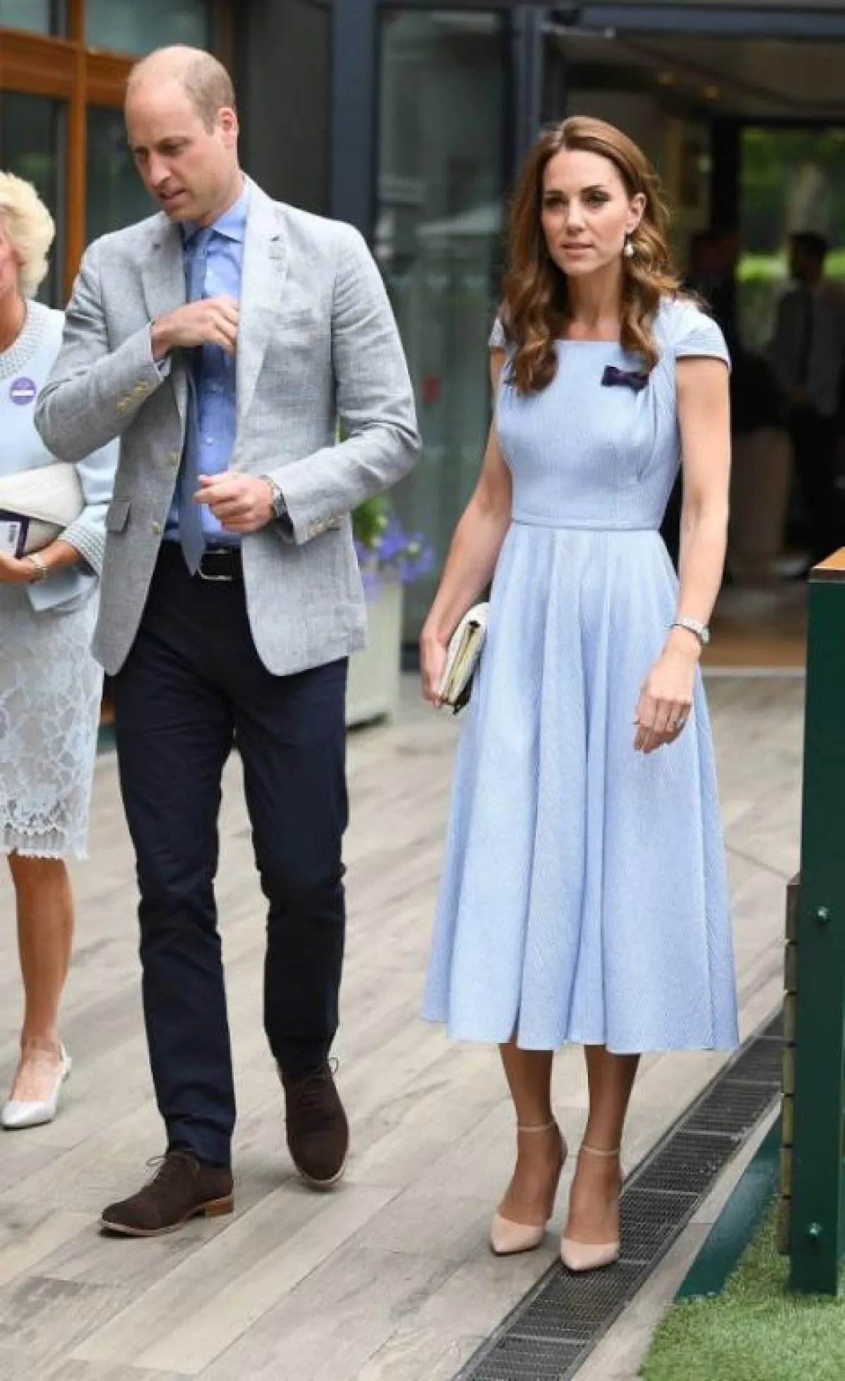 ظهرت دوقة كامبريدج برفقة زوجها الأمير ويليام لمشاهدة إحدى مباريات بطولة ويمبلدون، وهي ترتدي فستانًا بتوقيع دار إميليا ويكستيد Emilia Wickstead بـ اللون السماوي الفاتح مع زوج من الأحذية المدببة بدرجة من النيود.