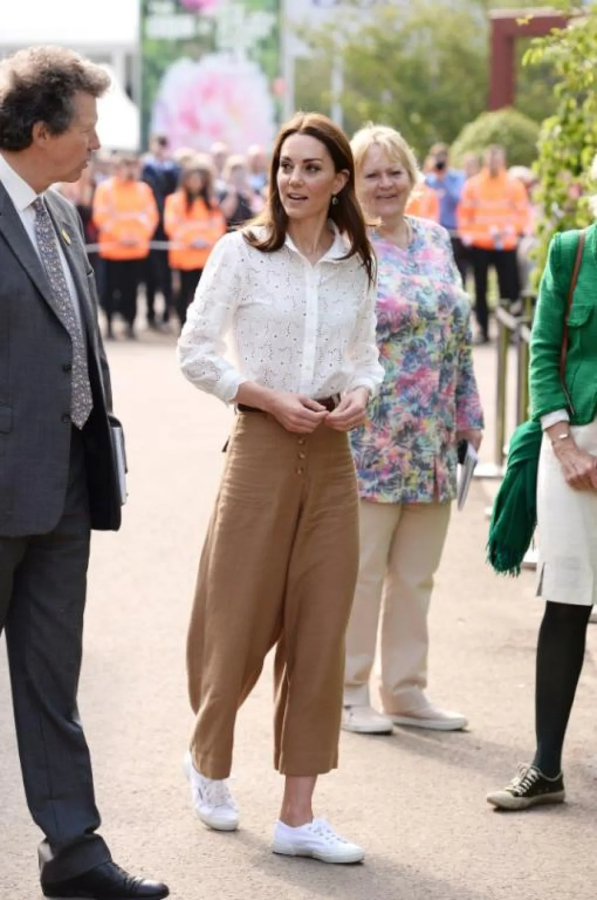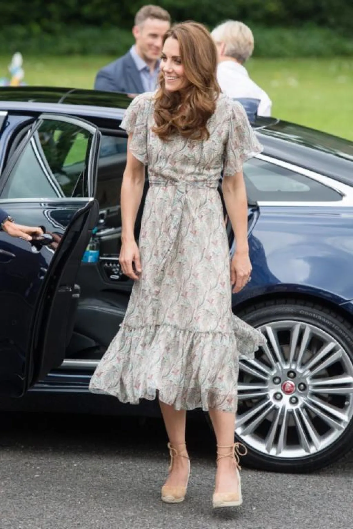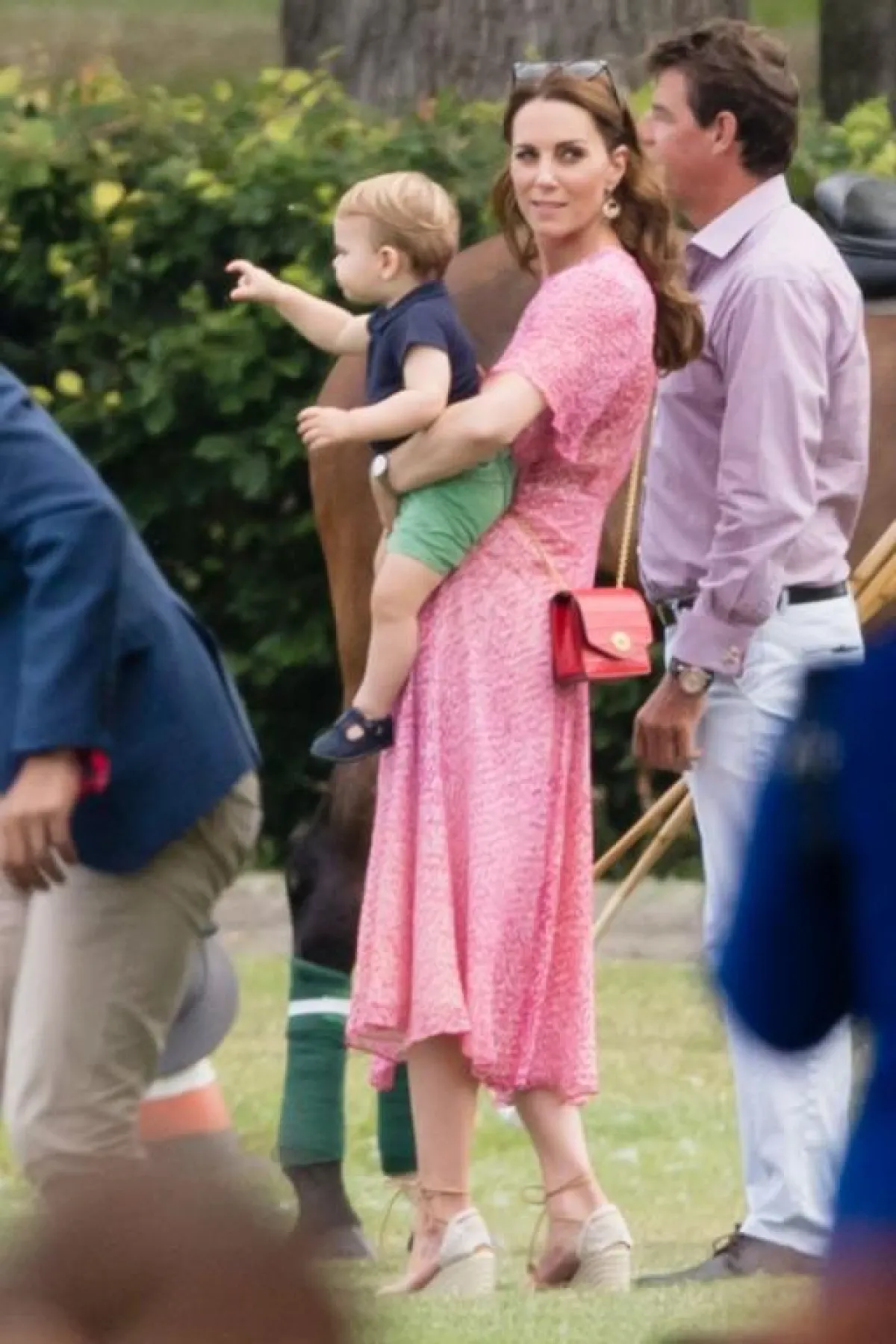 في نزهة عائلية، ظهرت كيت ميدلتون مع أسرتها، وهي ترتدي فستان ميدي موردًا ورديًّا، ونسقته مع حقيبة "كروس" حمراء، وحذاء عصري بكعب عريض.