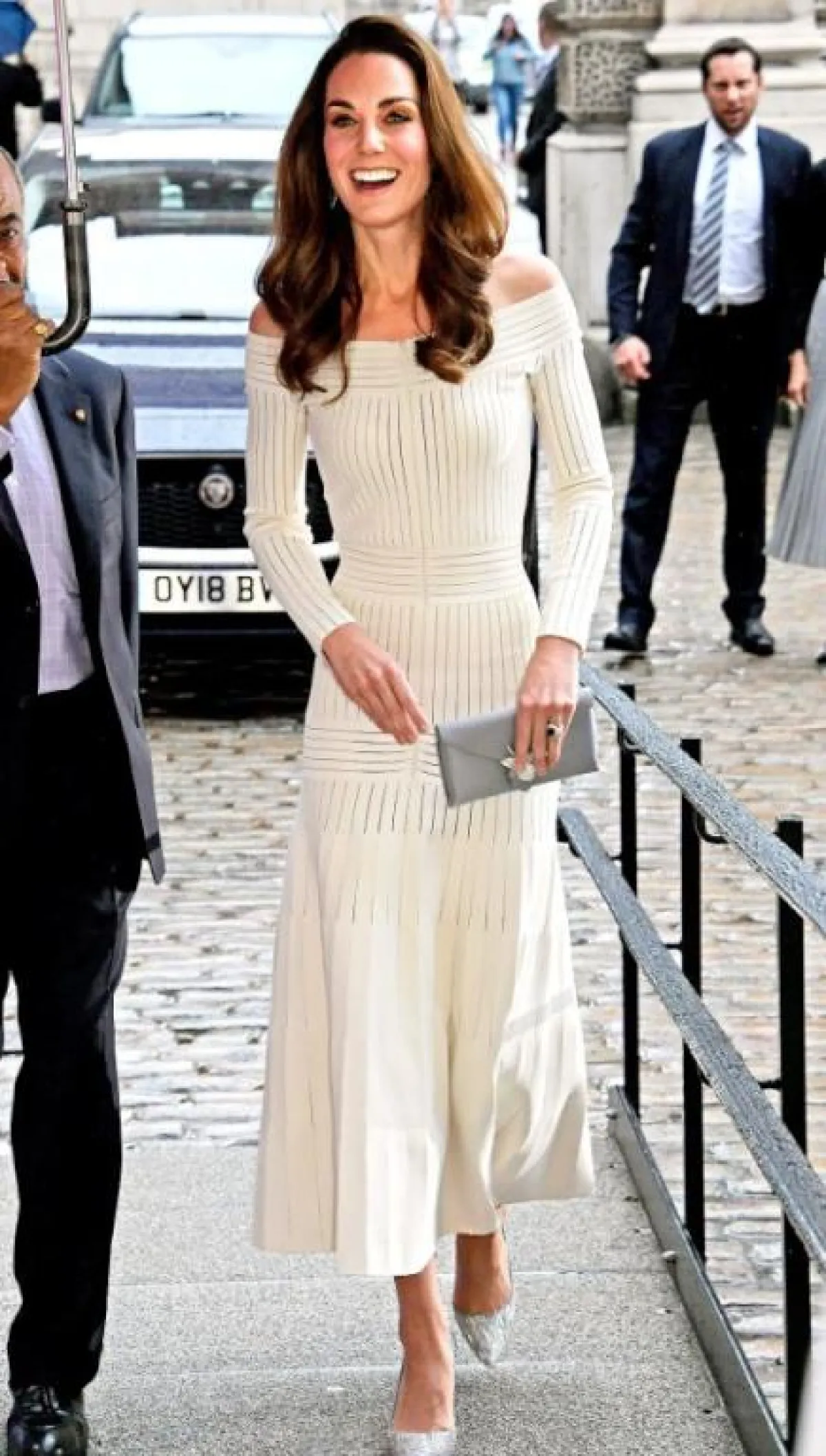 خرجت دوقة كامبريدج للاحتفال بعشاء في مطعم سبرينج، معتمدة فستانًا أبيض مكشوفًا من الأكتاف، بتوقيع علامة باربرا كاساسولا، مع زوج من الأحذية الكلاسيكية من جيمي تشو البراقة.