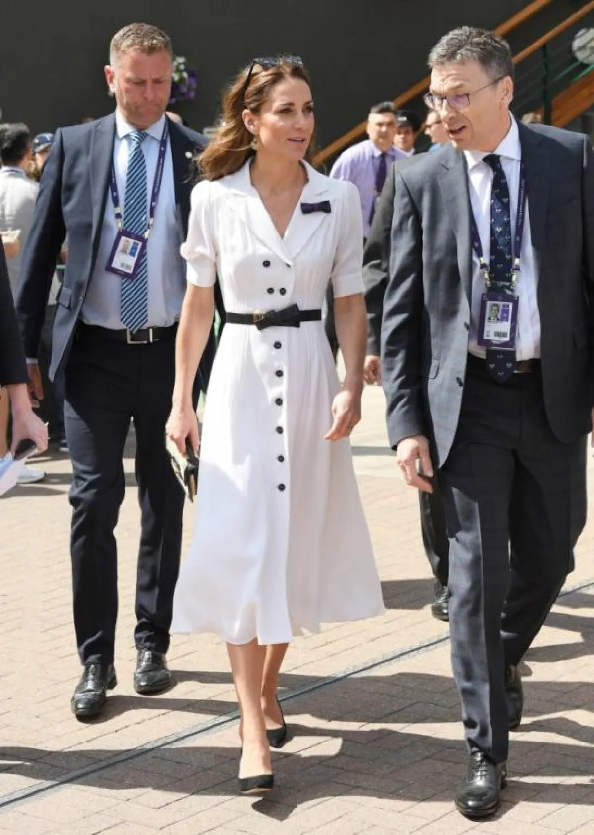 خلال مباراة للتنس في ويمبلدون، اعتمدت كيت ميدلتون فستانًا أبيض بتصميم القميص العصري مع الأكمام المنفوخة وحزام أسود أنيق من ألكساندر ماكوين Alexander McQueen .