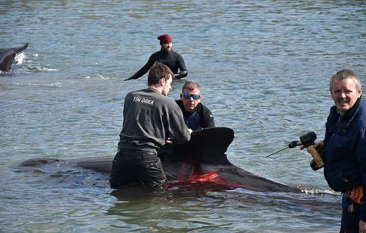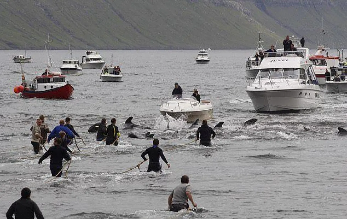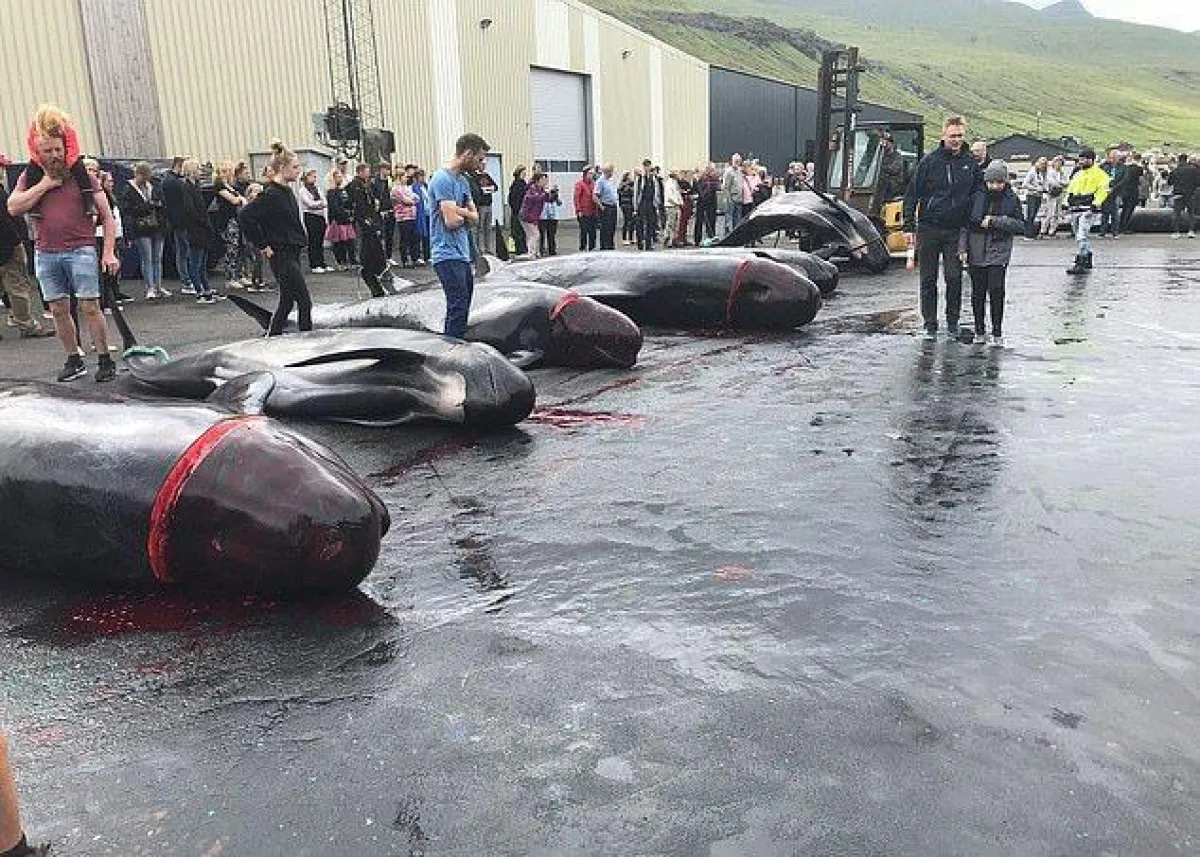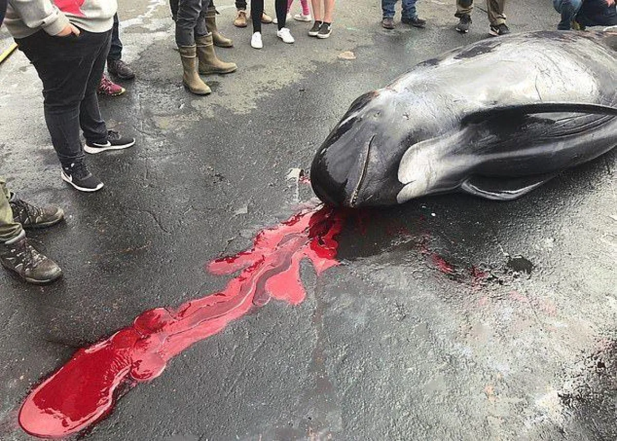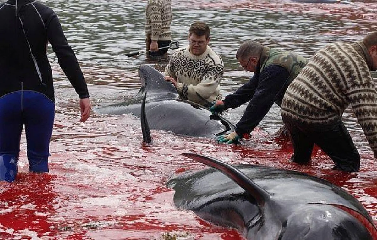 ربما أقل ما يقال عند مشاهدة هذه الصور أو يصفها بأنها مشاهد «بشعة» وغير إنسانية، وذلك عند قيام مجموعة من الصيادين بذبح 23 من الحيتان الطيارة كجزء من تقاليد عمرها قرون في خليج هفاليك وهي قرية بجزيرة ستريموي، بحسب ما جاء في بعض وسائل الإعلام.