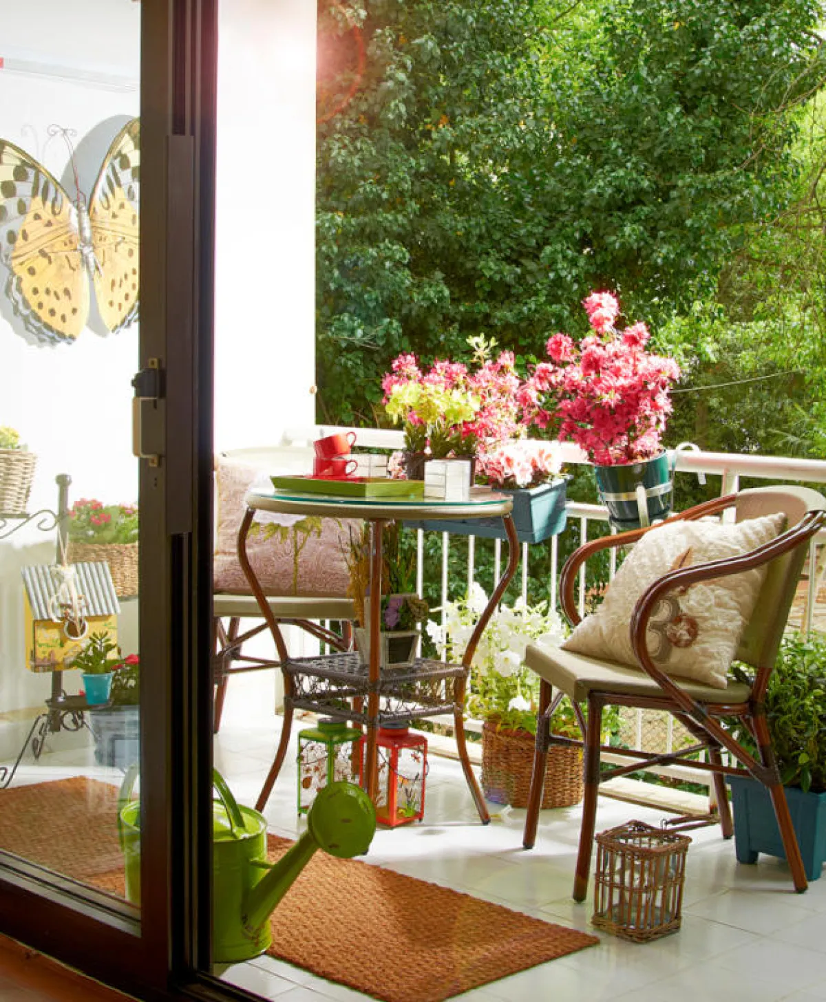 على الجدران، يحلو توزيع رفوف مشغولة من الحديد أو الألومينيوم أو الخشب، أو ألواح من الزجاج محاطة بإطارات من حديد، وذلك بشكل هندسي مُحدَّد أو عشوائي، على أن توزَّع عليها الورود والأزهارالملوَّنة. ومن جهةٍ ثانيةٍ، يمكن وضع ألواح من الخشب في وسط البلكونة، على تحمل هذه الألوح دوائر صغيرة تُعلَّق عليها شتول توحي كأنّ الجدار أخضر، ما يوحي للجالسين كأنَّهم في الحديقة، مع الإشارة إلى أنّ هذه الفكرة تُسخدم في المساحات المكشوفة حصرًا.
