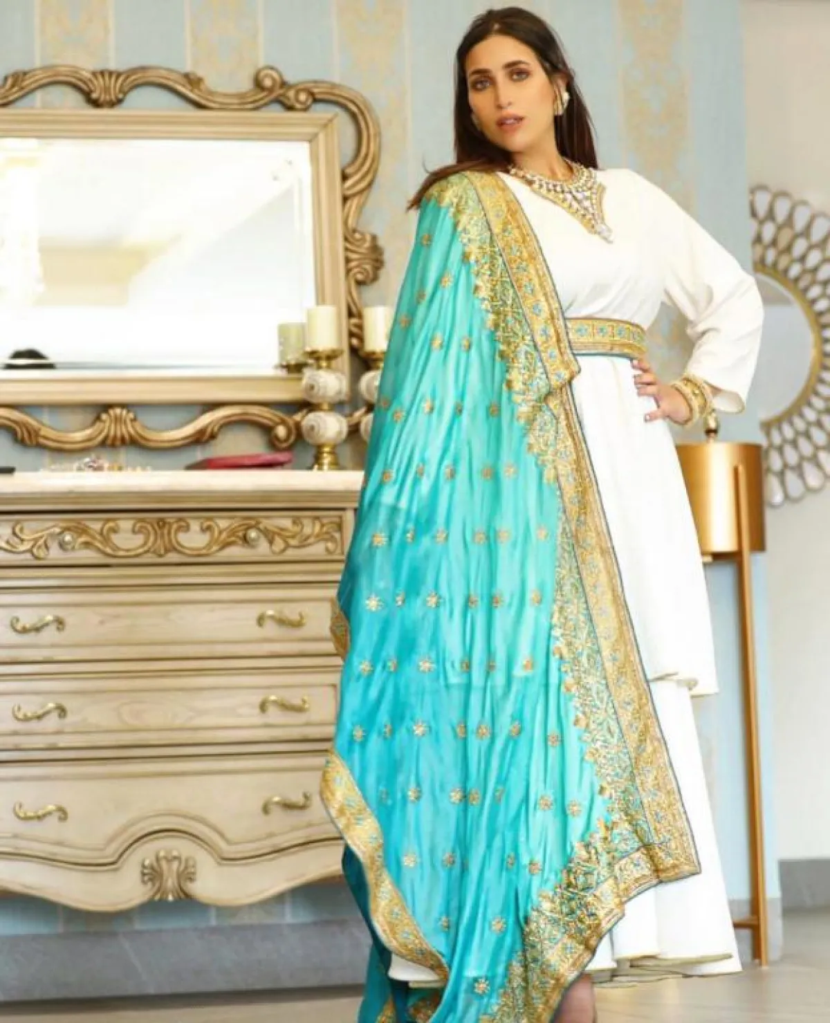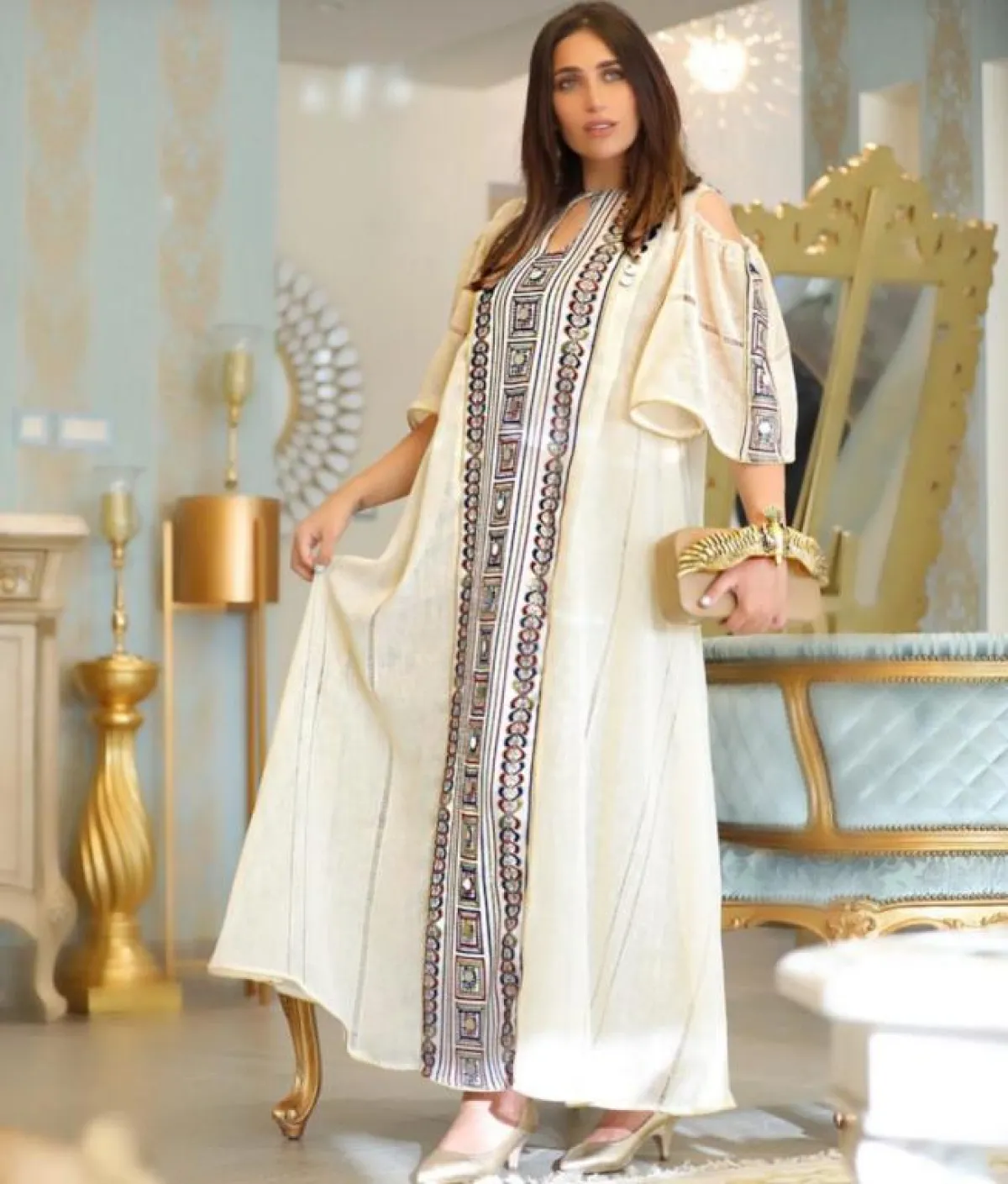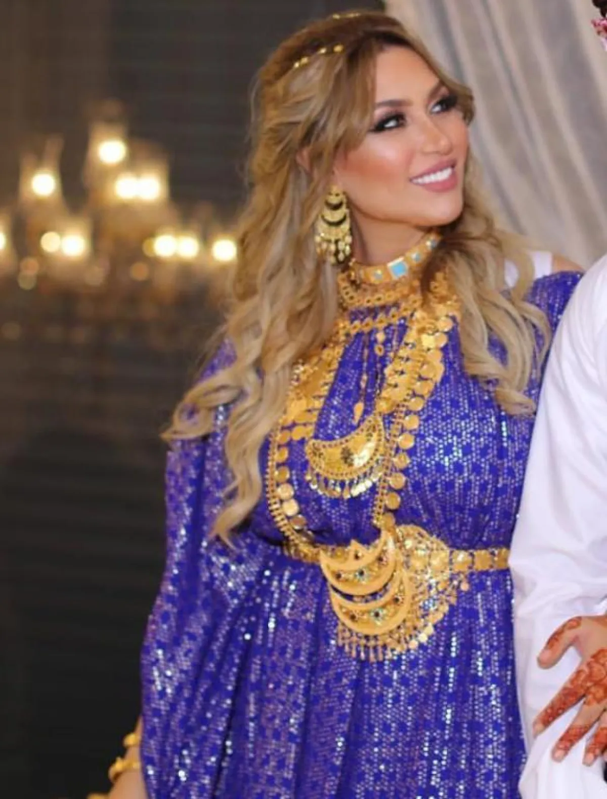 واختارت جلابية بيضاء بحزام ذهبي مطرز بالأزرق، مع وشاح أزرق مطرز بالذهبي، وارتدت اكسسوارات عدة ضخمة ومميزة باللون الذهبي، كما تجملت بجلابية حمراء بتطريزات عتيقة ذهبية ووشاح ذهبي، وجلابية أخرى باللون البنفسجي مزينة بالفضي والاكسسوارات الذهبية الضخمة.