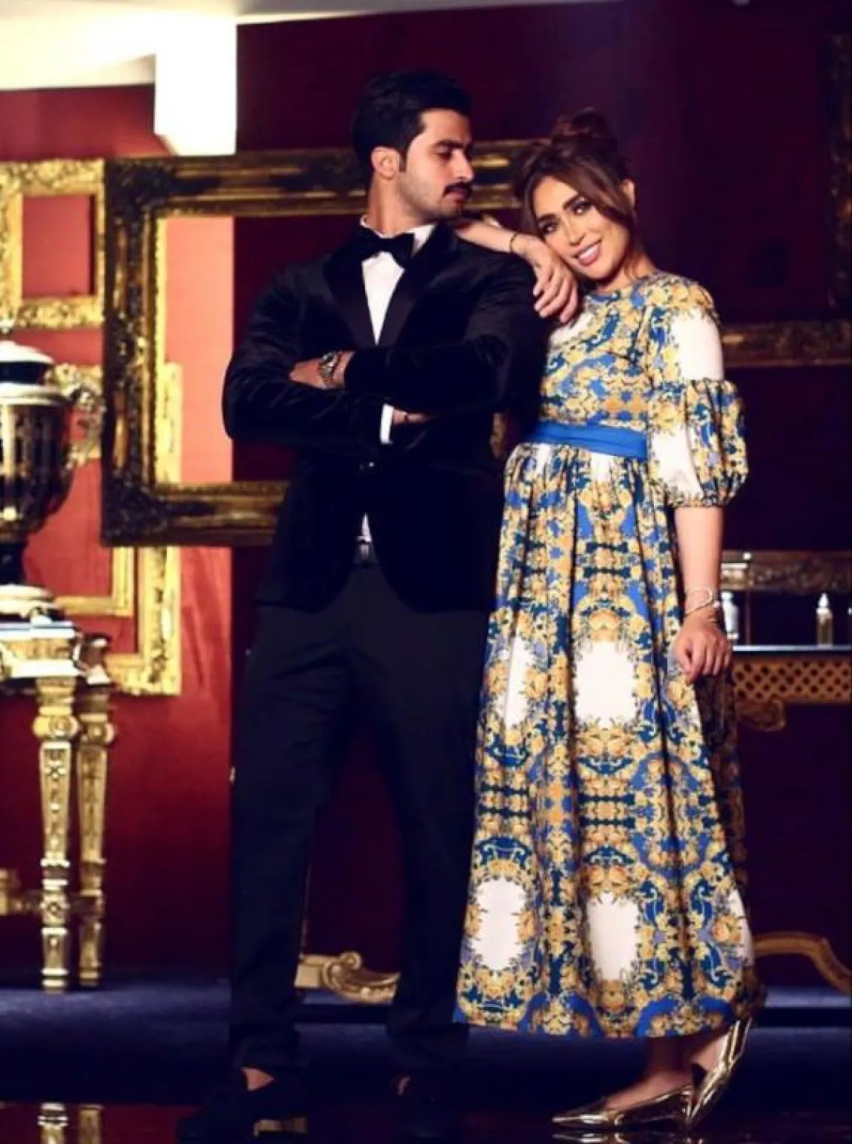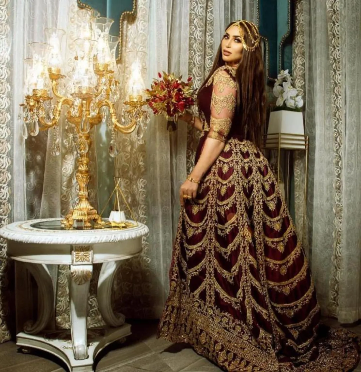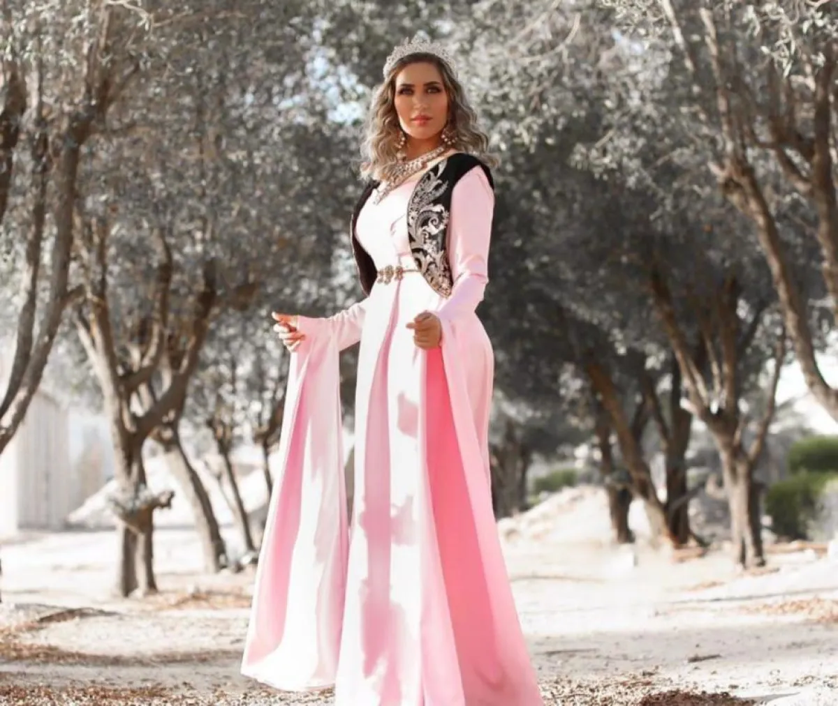 واختارت جلابية بيضاء بحزام ذهبي مطرز بالأزرق، مع وشاح أزرق مطرز بالذهبي، وارتدت اكسسوارات عدة ضخمة ومميزة باللون الذهبي، كما تجملت بجلابية حمراء بتطريزات عتيقة ذهبية ووشاح ذهبي، وجلابية أخرى باللون البنفسجي مزينة بالفضي والاكسسوارات الذهبية الضخمة.