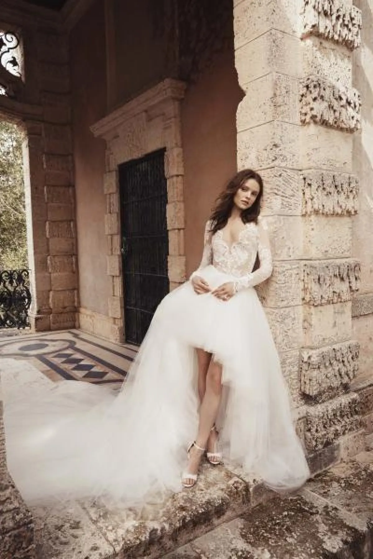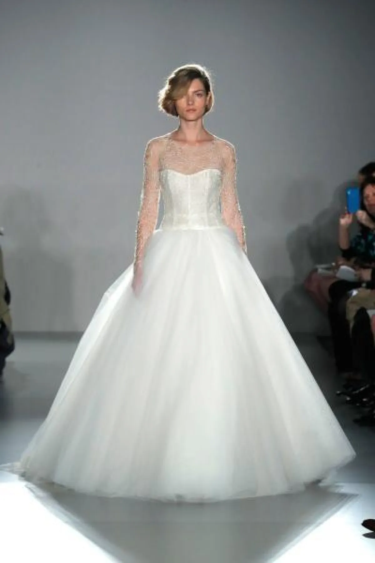 قدمت ماركة Amsale موديلات فساتين زفاف بكم شفاف مطرزة أو بقماش الدانتيل الناعم.