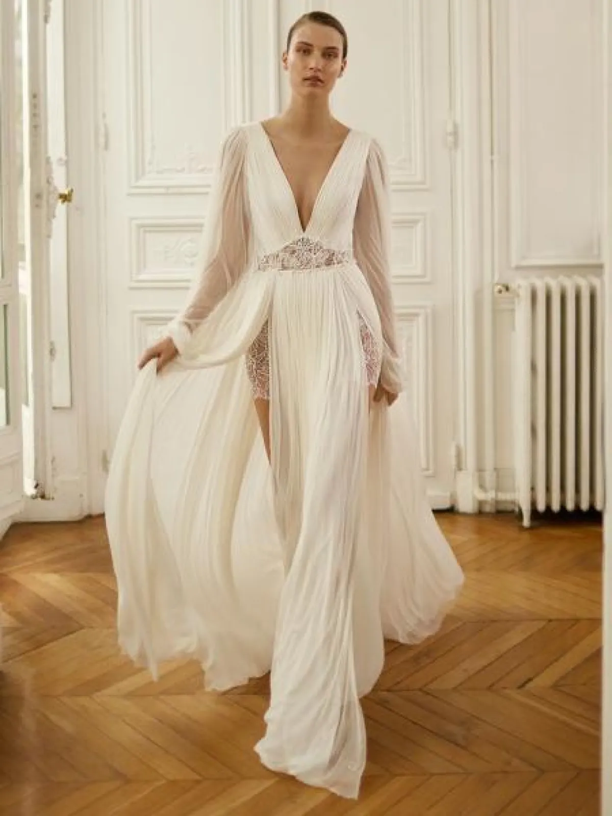 من صيحات فساتين الزفاف الرائجة التي برزت بقوة خلال أسبوع الأعراس لعام 2020، واعتمدتها العديد من العرائس مؤخراً، وهي فساتين زفاف كم طويل شفاف، حيث تضيف لمسة ناعمة لإطلالة العروس.