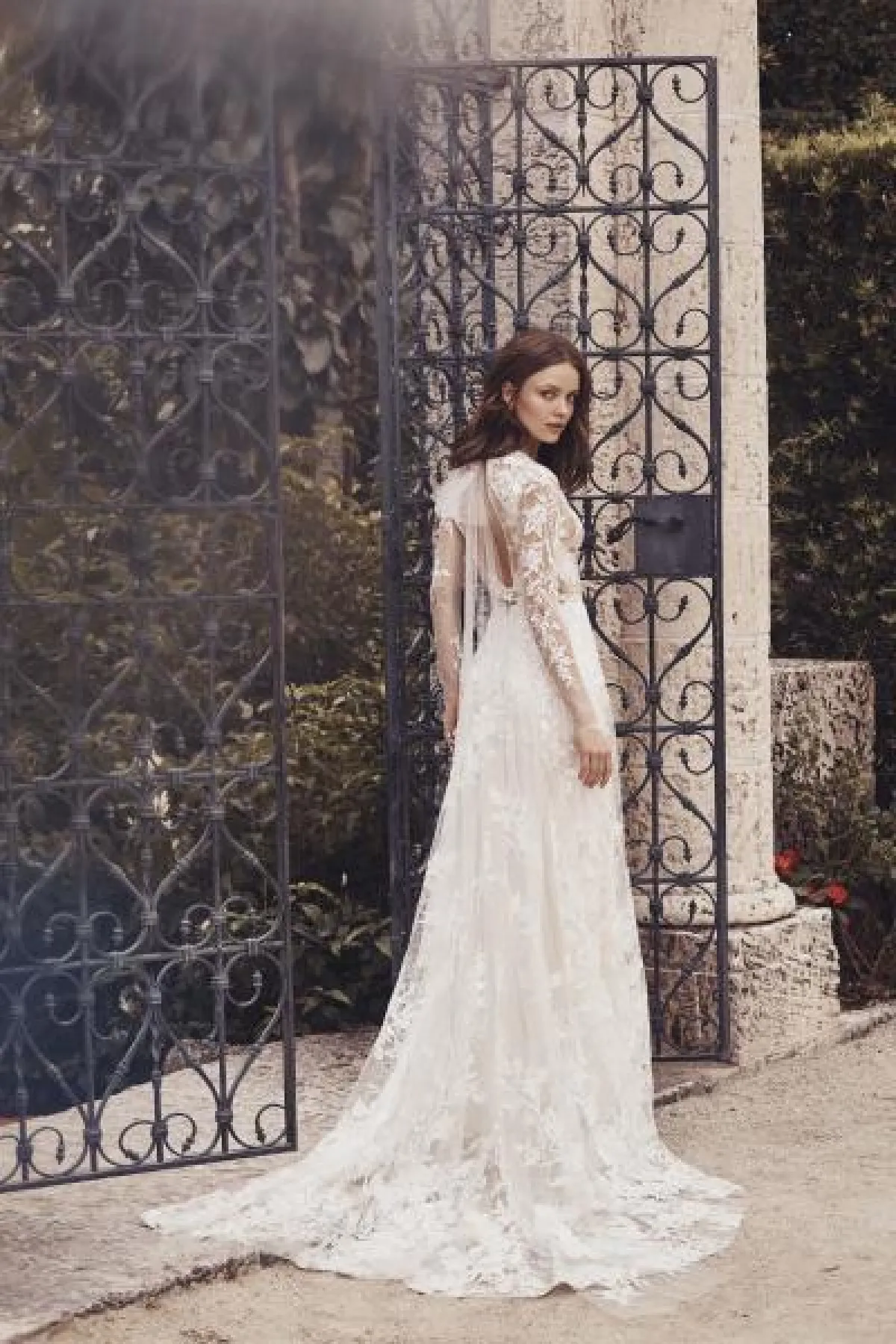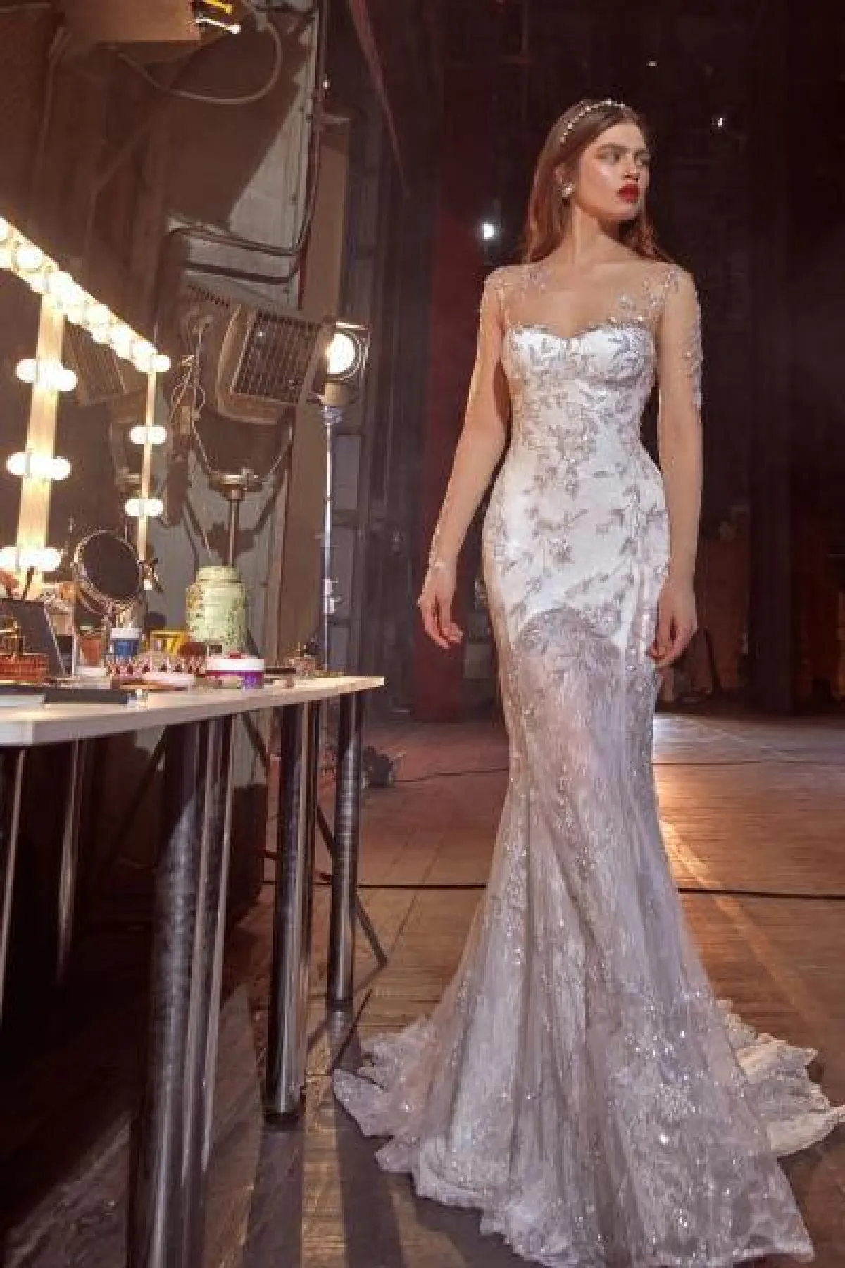 أيضاً قدمت ماركة Galia Lahav فستان زفاف أنثوي بقماش شفاف مرصع بتطريزات برّاقة في مختلف أنحاءه، وبأكمام طويلة من التول المطرز، وهو بتصميم ضيق يبرز انحناءات الجسم.
