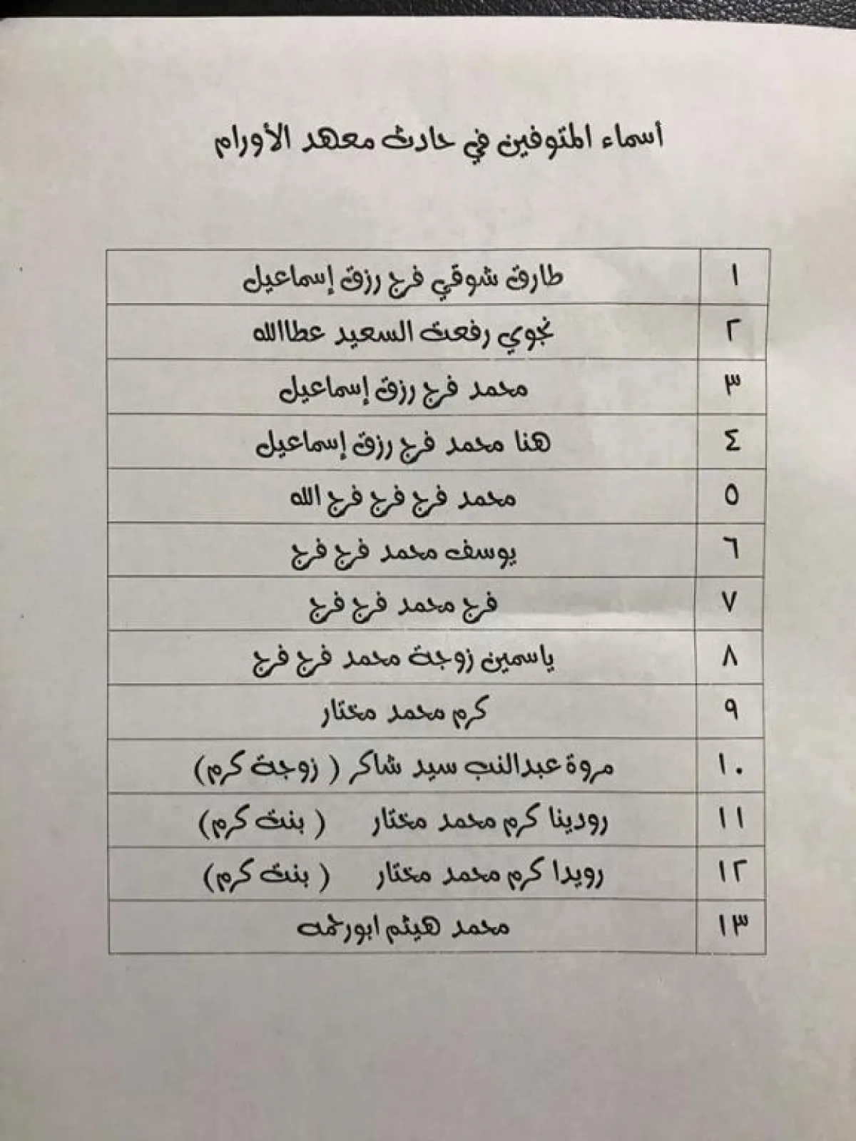 ومن ضمن الضحايا الـ17 أيضاً في الحادث عائلة سيد فرج، ويعمل بهيئة النقل العام فرع منطقة فم الخليج، وتوفي هو وزوجته وابنه الأكبر وحفيدته وكانوا جميعهم في الحافلتين.