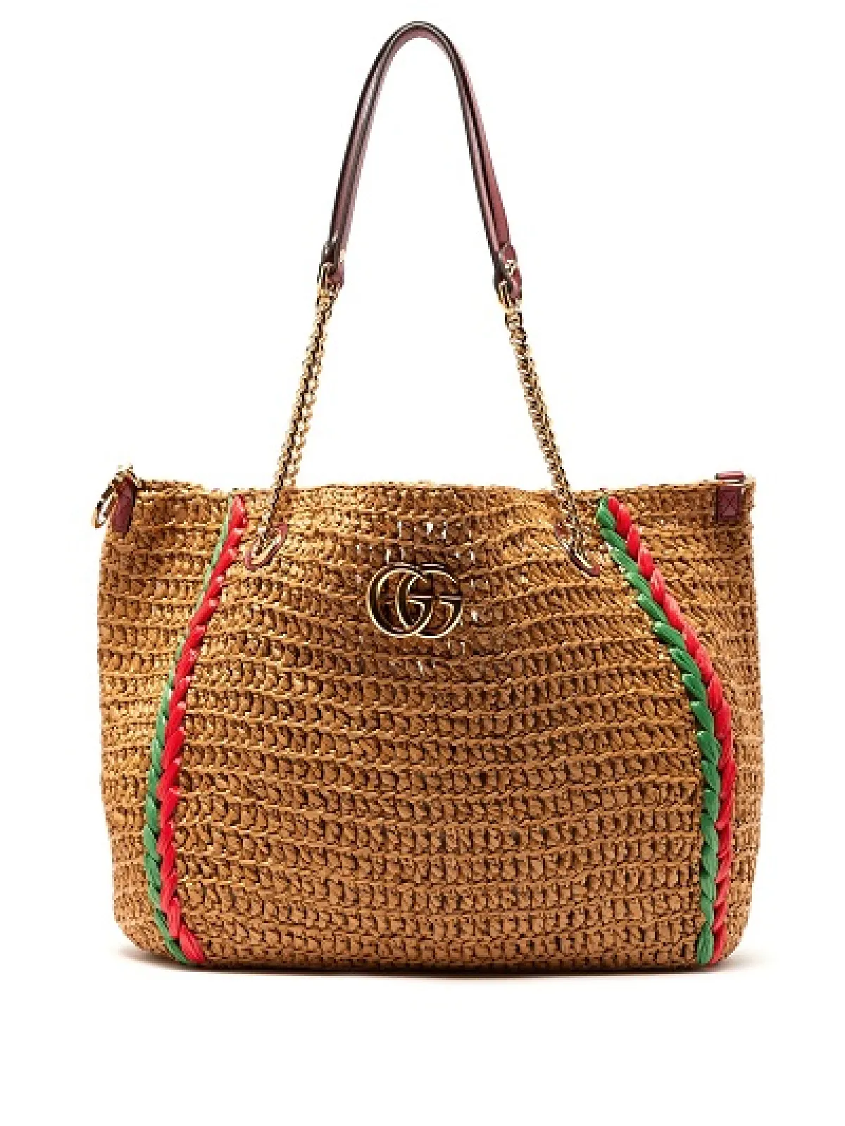 تعتبر حقيبة القش للكتف باللون البيج هذه، من أحدث الإضافات إلى مجموعة Marmont GG من دار غوتشي Gucci. تم تصميمها من قش الرافيا، الذي يعد موضة أساسية لصيف 2019، وهي تحتوي على حزام من سلسلة معدنية ذهبية مع مقابض جلدية شرائط منسوجة باللونين الأحمر والأخضر الأيقوني.
