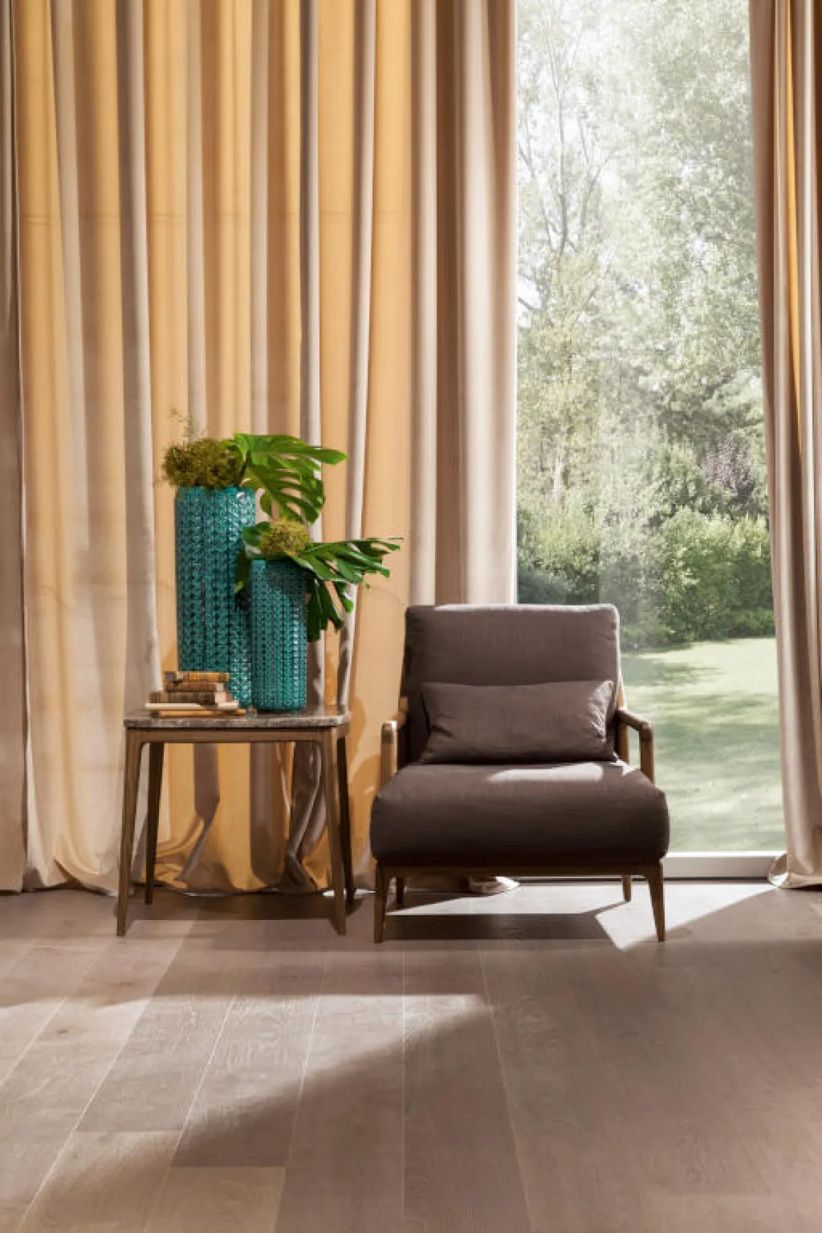كرسي منفرد ذو تصميم مريح، وهو مناسب للاسترخاء وقراءة كتاب، مع طاولة جانبيَّة