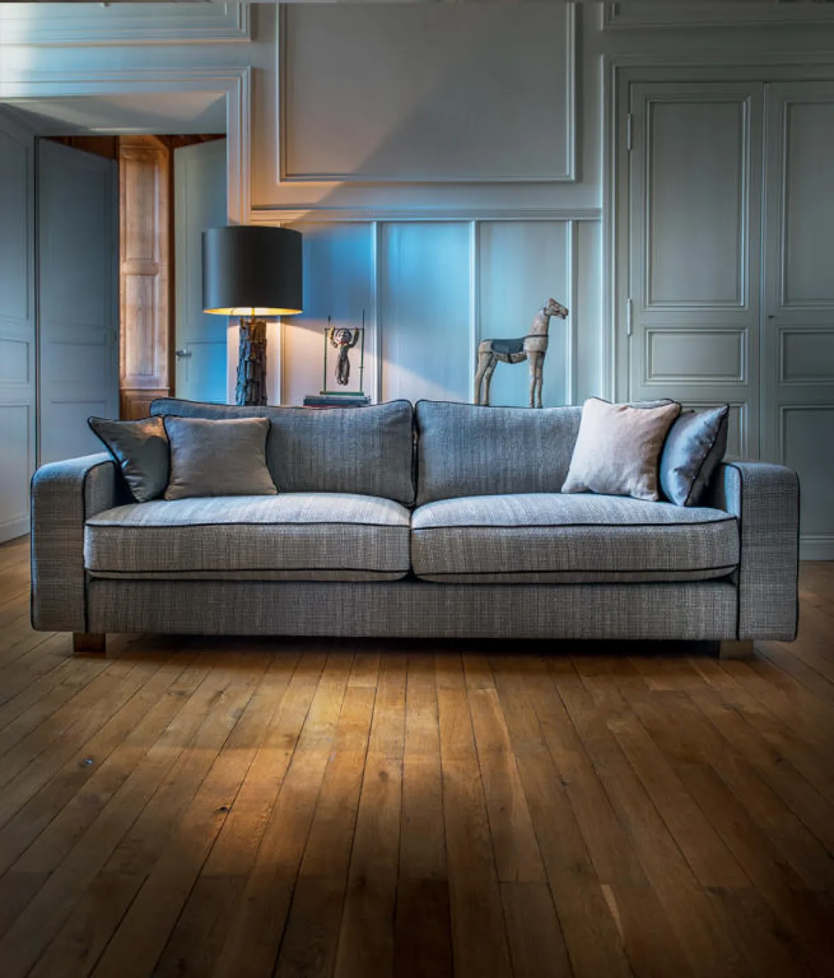 غرفة جلوس مؤثَّثة بـ"صوفا" كبيرة، وعصريَّة التصميم، باللون الرمادي الغامق. تبدو طاولة وسط من الخشب باللون الأبيض