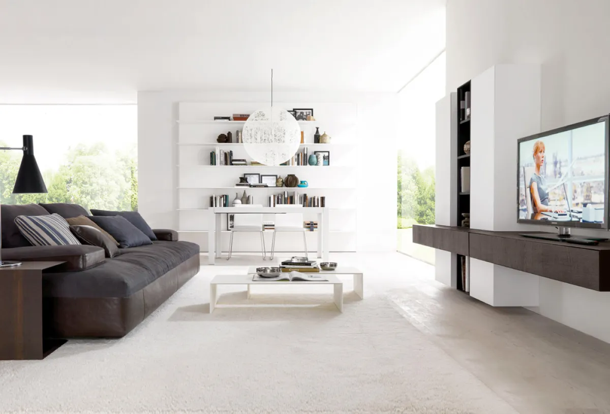 كنبة كبيرة عبارة عن قطع مجمَّعة سويَّةً لعمل "صوفا" كبيرة باللون الأبيض، وتبدو طاولة وسط مربعة بتصميم في غاية البساطة