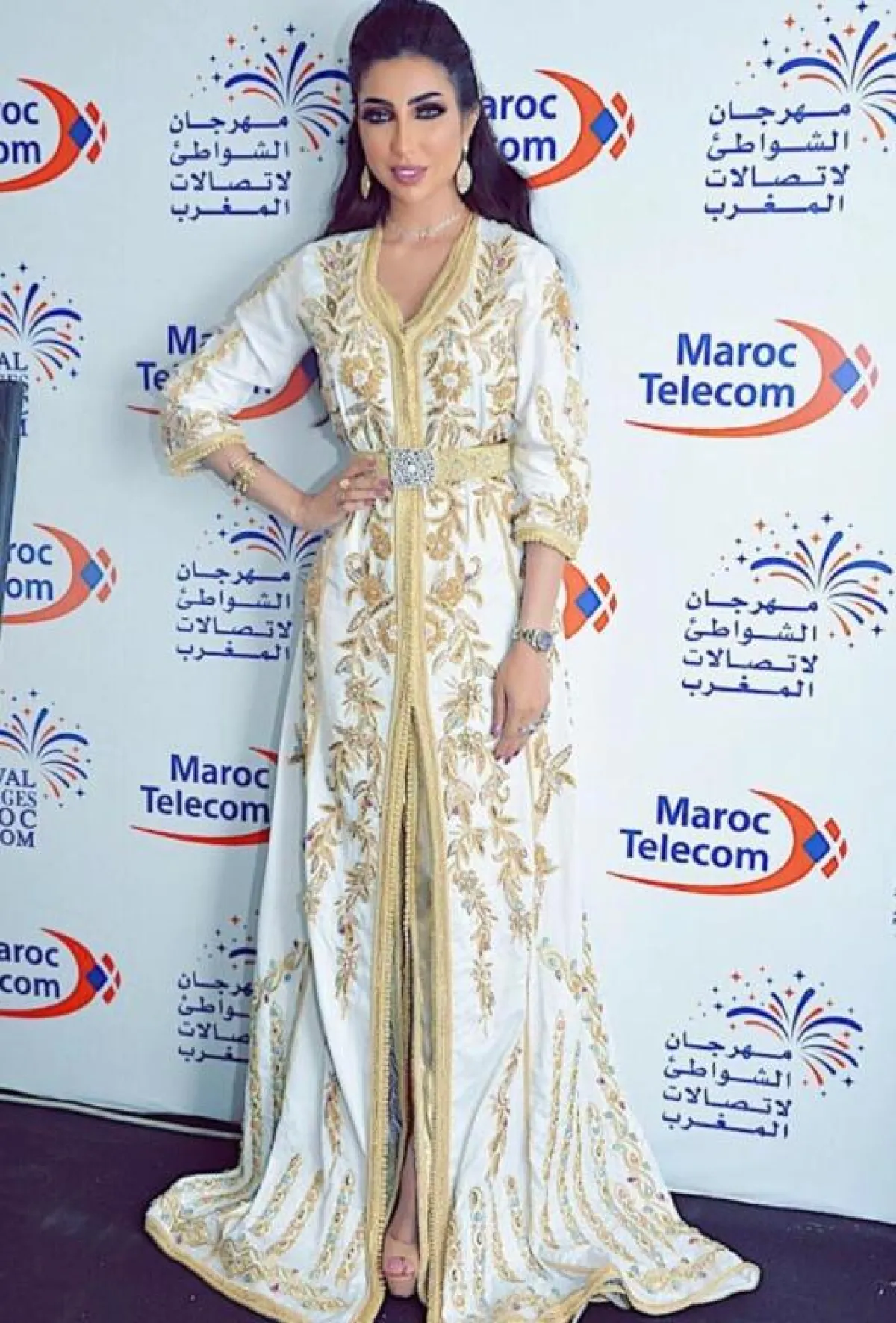 أما ميساء مغربي فتألقت بقفطان أبيض مزين بزهور برتقالية وزهرية وزرقاء، بالإضافة لعدة نقوشات من المنتصف باللون الفضي، وأطلت بجلابية بيضاء مخططة، يزينها حزام خصر وجيوب من الدانتيل.