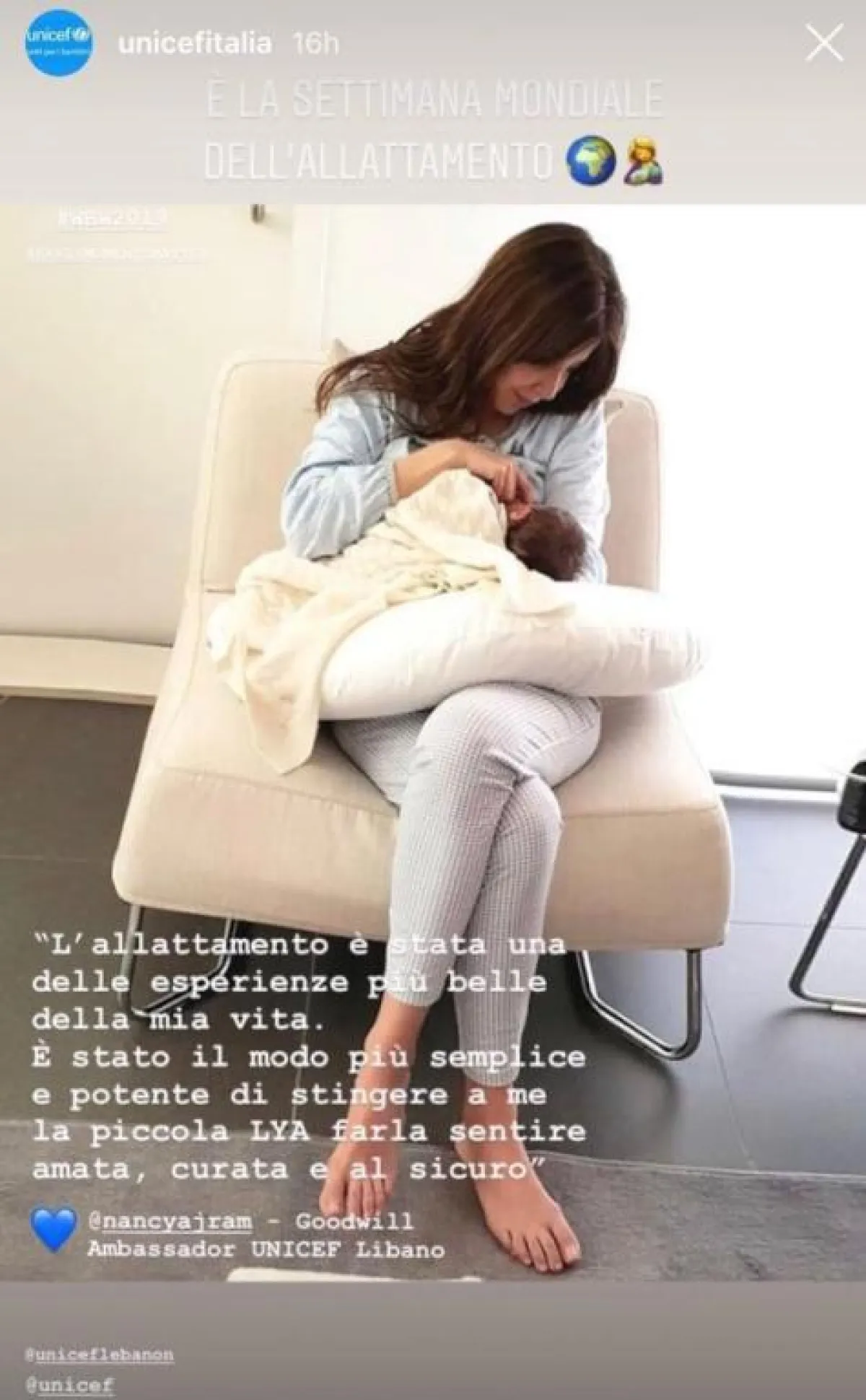 وفي مبادرة منها للإضاءة على أهمية الرضاعة الطبيعية بالنسبة إلى الأم وطفلها، وجدت "اليونيسف" أن صورة نانسي وليا هي النموذج الأفضل الذي يخدم هذا الهدف، وقامت بنشرها عبر حسابها على "إنستا ستوري"، للإشادة بتجربتها كفنانة وكسفيرة للنوايا الحسنة في لبنان الترويج للرضاعة الطبيعية.