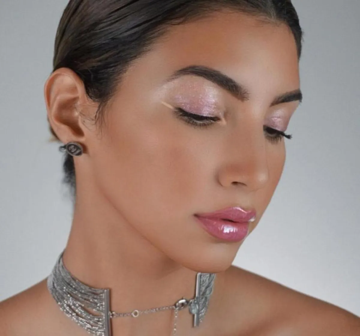 ولـ مظهر ناعم أنثوي، وضعت مستحضرات تجميل بدرجات اللون البني اللامع، وكحلًا سائلًا مسحوبًا باللون الأسود، وفي مظهر آخر وضعت على كسرة العين كحلًا ذهبيًّا ممدودًا لخارج العين، ووضعت في بقية العين لونًا بنيًّا بدرجتين، ولونًا أبيض تحت الحاجب، وأحمر خدود ذهبيًّا، وطلاء شفاه بنيًّا.