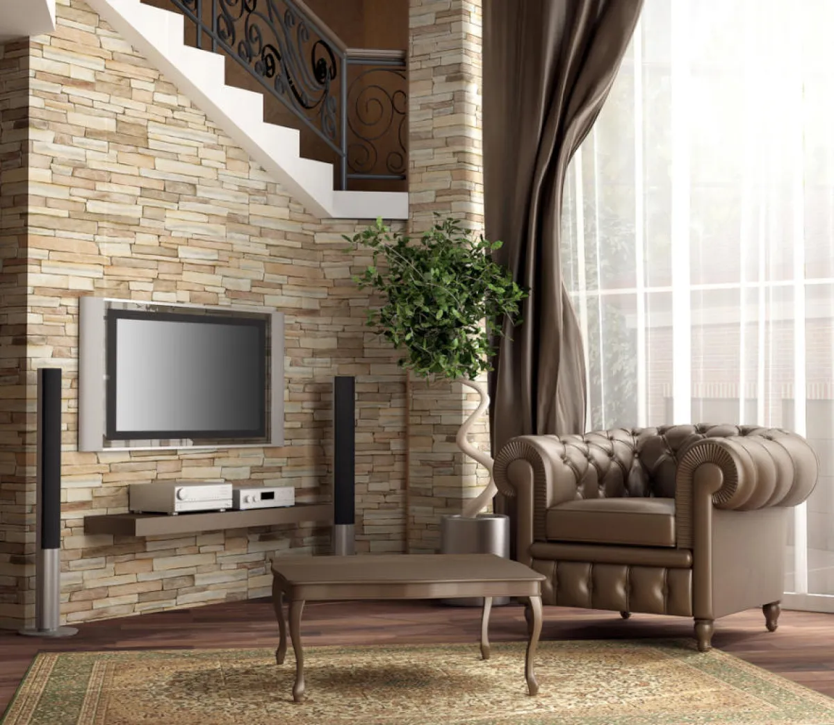 • عوضًا عن إكساء الجدران بالحجر أو الخشب، يمكن تركيب ورق جدران ثلاثي الأبعاد.