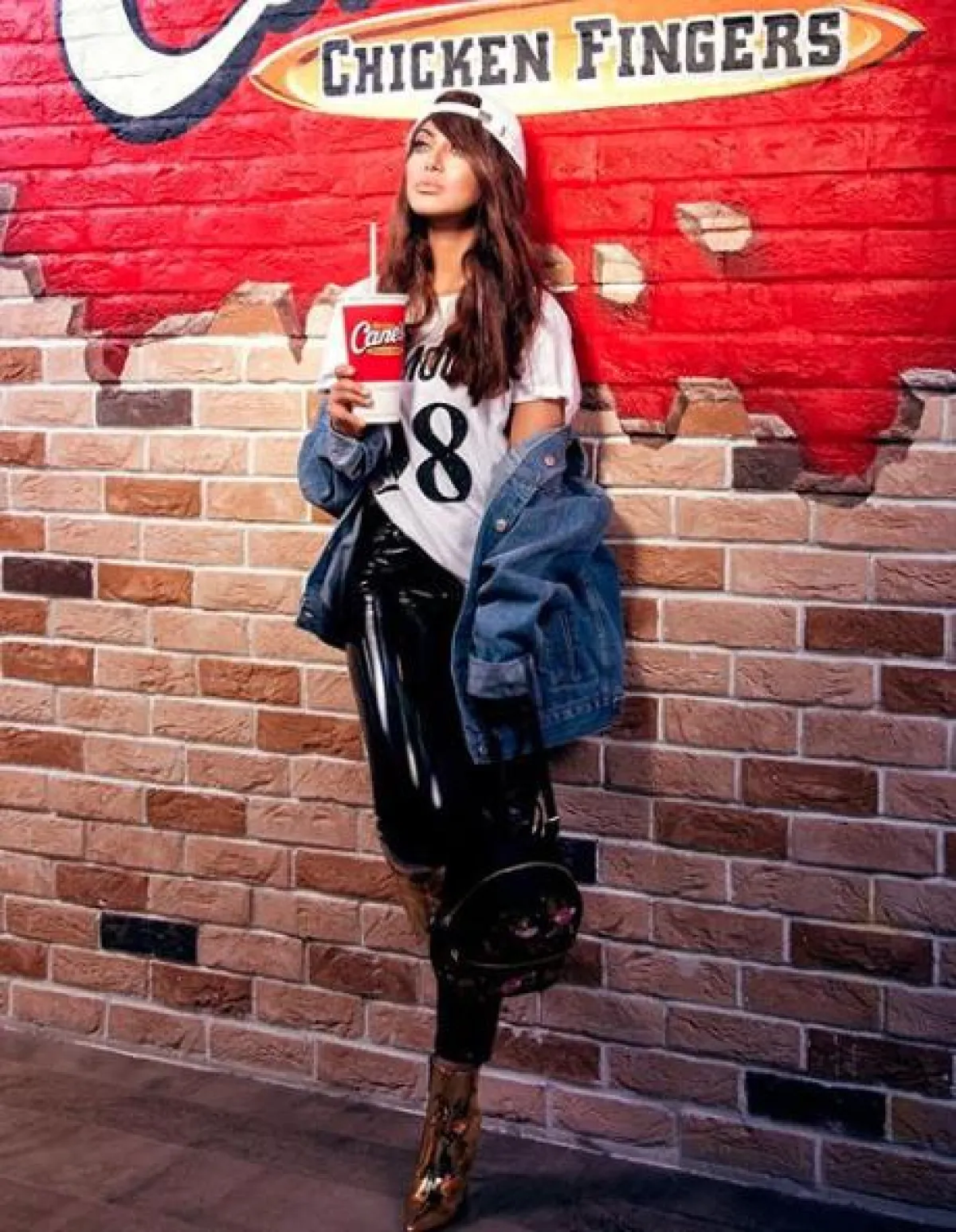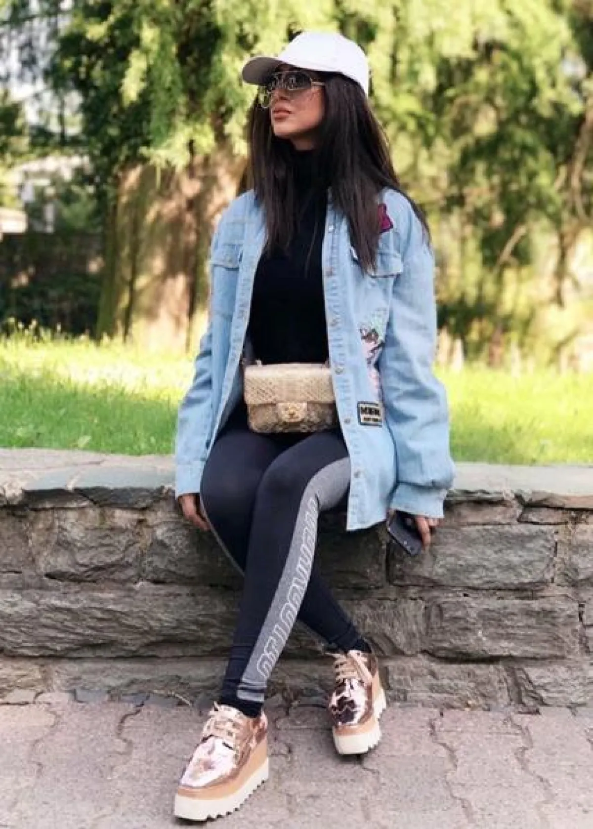 تحدثنا سابقًا عن أنّ شيلاء سبت تعشق تنسيق الاطلالات العصرية والأزياء المبتكرة، وهذا اللوك أكبر دليل على ذلك، حيث إنها اختارت بنطلونًا من الجلد الأسود اللامع، نسقت معه تيشرت قطنية باللون الأبيض وجاكيت جينز أزرق، وحذاء كاحل من الجلد الميتالك الذهبي، وأكملت اللوك بحقيبة ظهر بتصميم شبابي وقبعة ارتدتها بطريقة “صبيانية”.