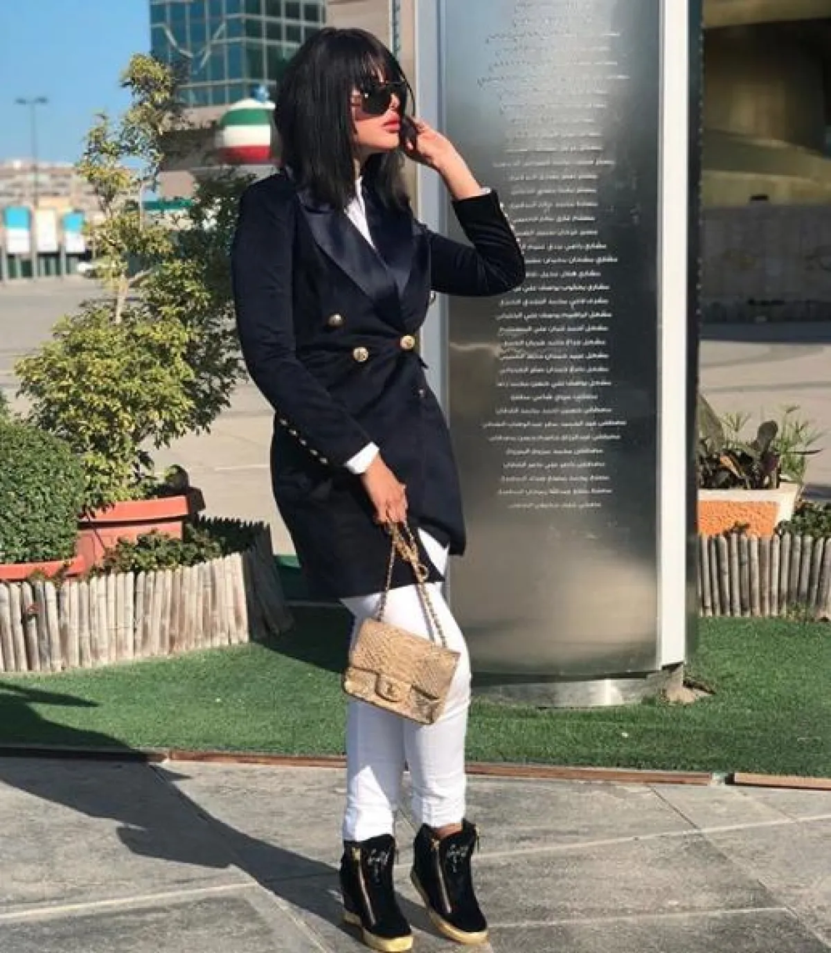 لأحد المشاوير المسائية شاهدنا شيلاء سبت وقد اعتمدت أسلوب سبور شيك من حيث تنسيق الملابس، حيث اختارت ما يشبه البدلة الرسمية مؤلفة من بنطلون قماشي وجاكيت له سحاب معدني، كلاهما باللون الأزرق الداكن، وقد نسقت معهما تيشرت باللون الأبيض وحذاء كعب عالٍ من “فالنتينو” Valentino وشنطة يد أنيقة من الجلد باللون الأحمر.