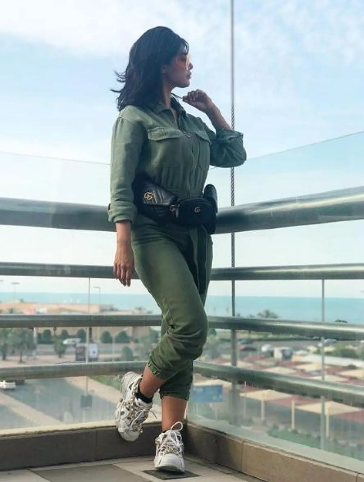 الجمبسوت الكاجوال إحدى أبرز صيحات الموضة لهذا الموسم، ولا سيّما المصنوع من الأقمشة القطنية العملية والمريحة، مثل الذي اعتمدته شيلاء سبت مؤخرًا لأحد المشاوير الصباحية، حيث إنها اختارت جمبسوت كاجوال باللون الأخضر الزيتي، أكمامه طويلة وله جيبان عند منطقة الصدر، وقد نسقت معه حذاءً رياضيًّا أبيض، وحقيبة خصر من الجلد من “غوتشي” Gucci ونظارات شمسية لافتة من “توم فورد” Tom Ford.