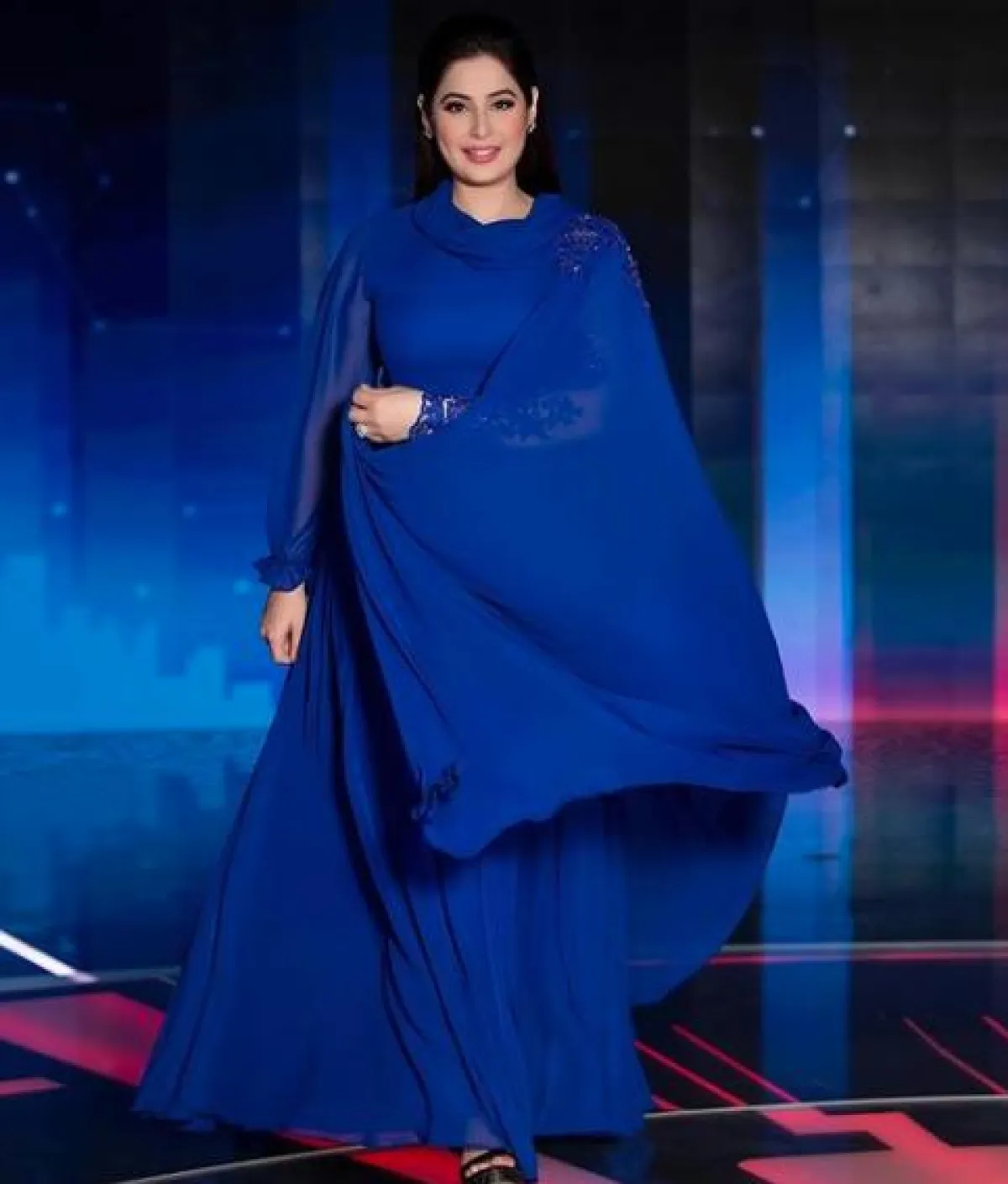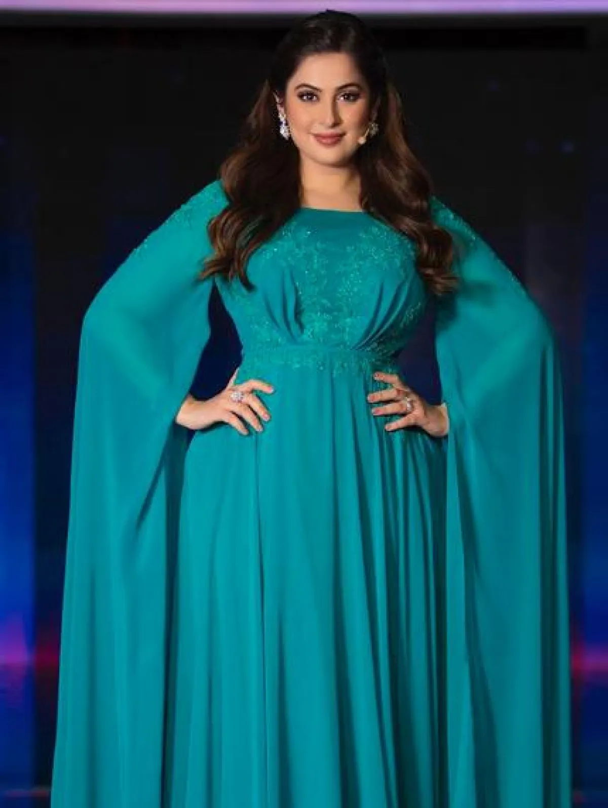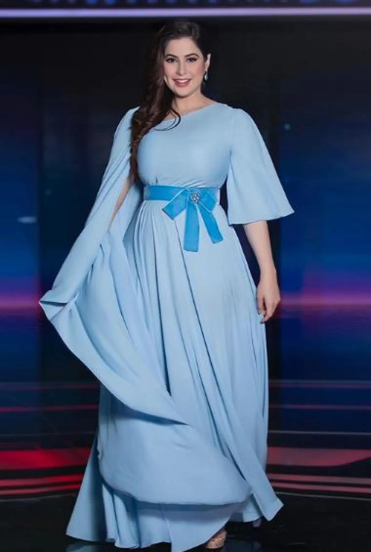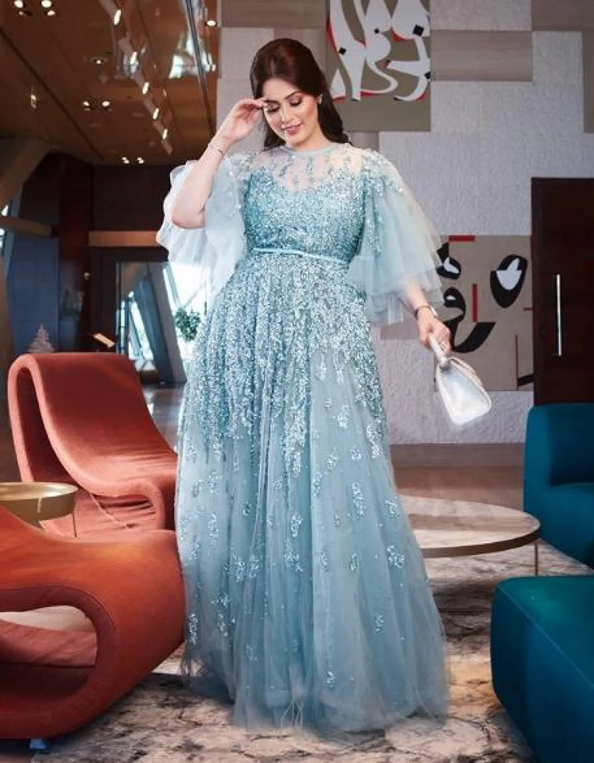 اطلالة لافتة مثالة لسهرات عيد الأضحى اعتمدتها رؤى الصبان، تستطيعين أن تستوحي منها، كانت عبارة عن فستان سهرة من التول باللون الأرزق الهادئ، مطرز بالترتر البراق باللون الأزرق أيضًا، وأكمامه مصنوعة من طبقات من الكشكش، مزين بحزام على الخصر وتنورته كلوش، وقد نسقت معه شنطة يد صغيرة باللون الفضي الميتالك.
