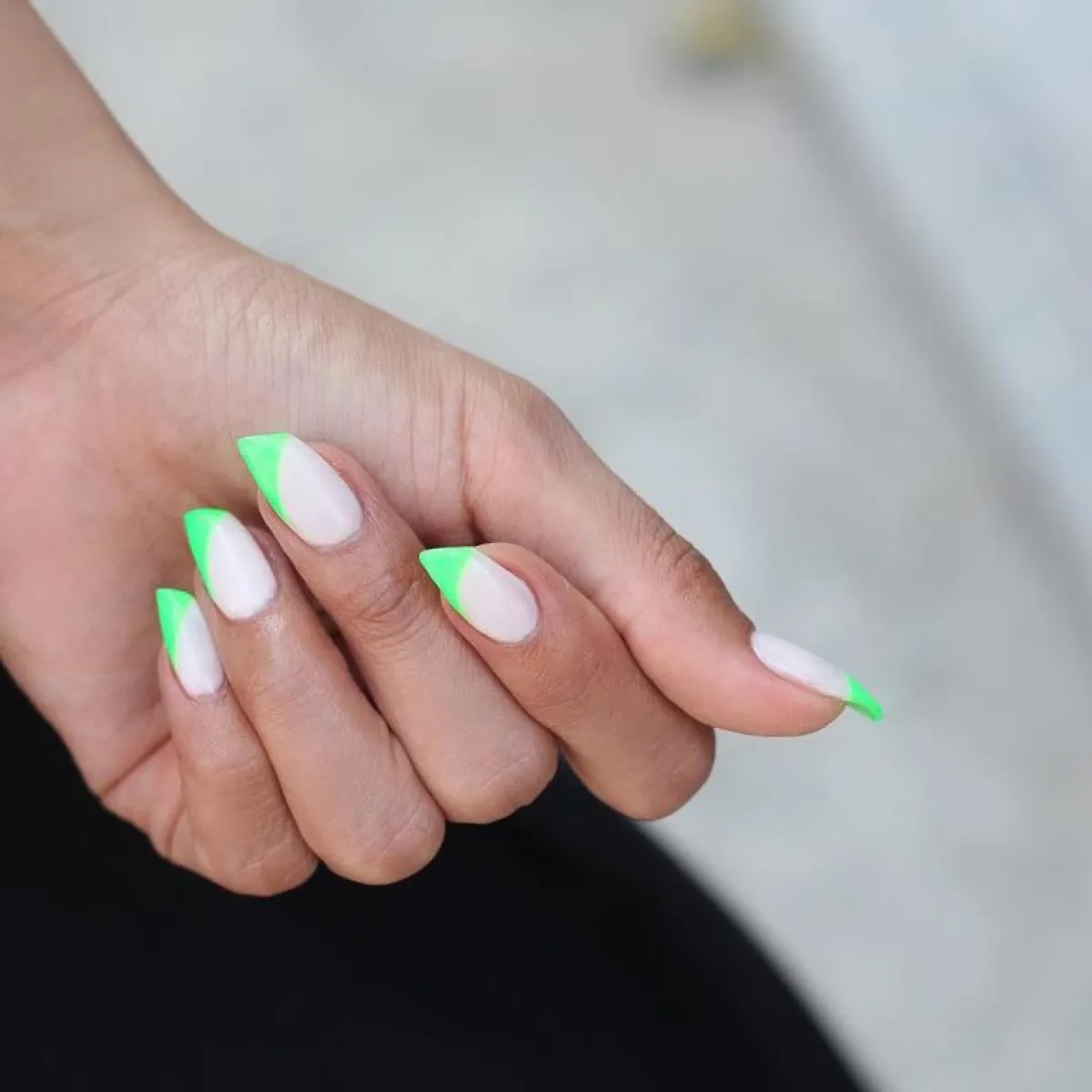يمكنكِ تجربة الأظافر المائلة مع لمسة الفرينش لأظافر بالألوان النيون، مثل درجة الأخضر الفوسفوري، لاطلالة مميزة هذا الصيف، وبالسهرات سوف تصبح أظافركِ أكثر بروزًا بالأماكن ذات الإضاءة الخافتة.